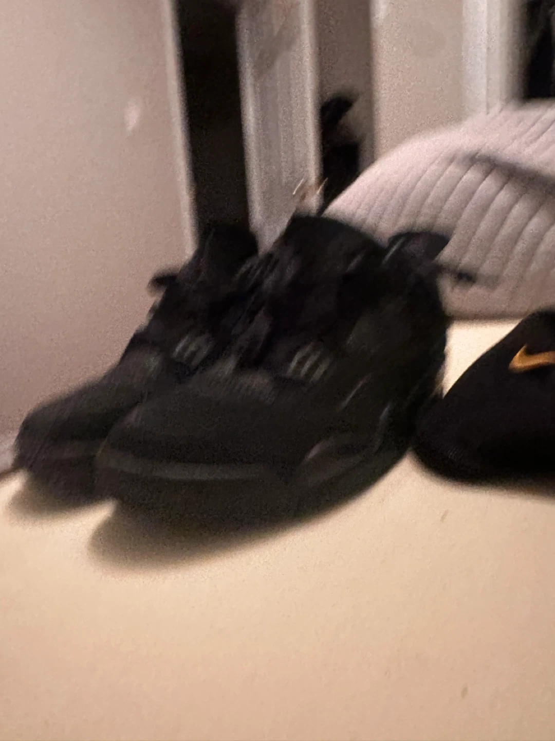 Selling a pair of black Air Jordan 4 sneakers! They're in used condition, as you can see in the photos. Still lots of life left in them!