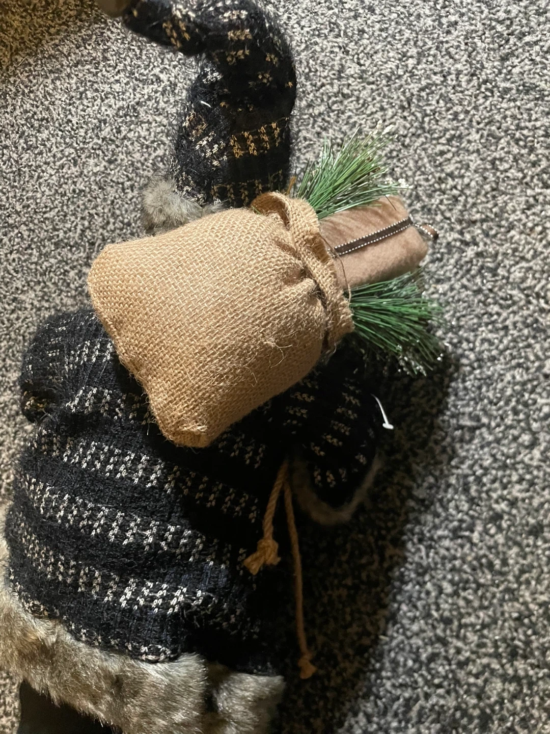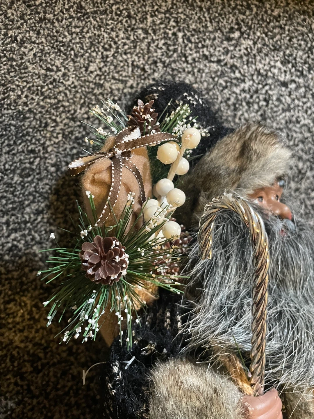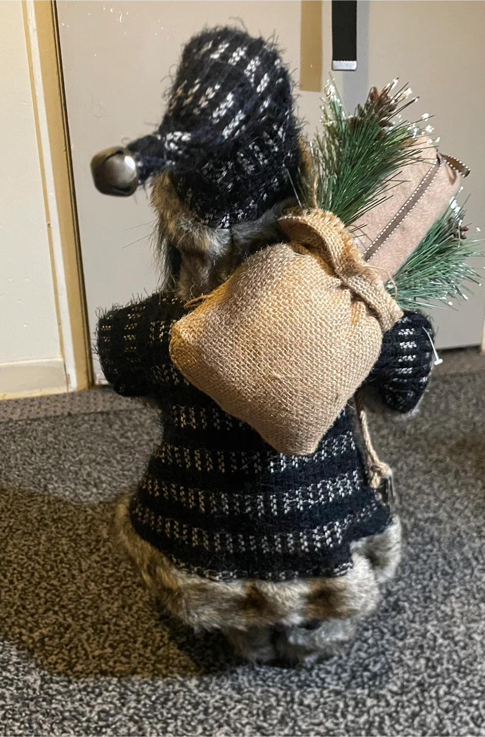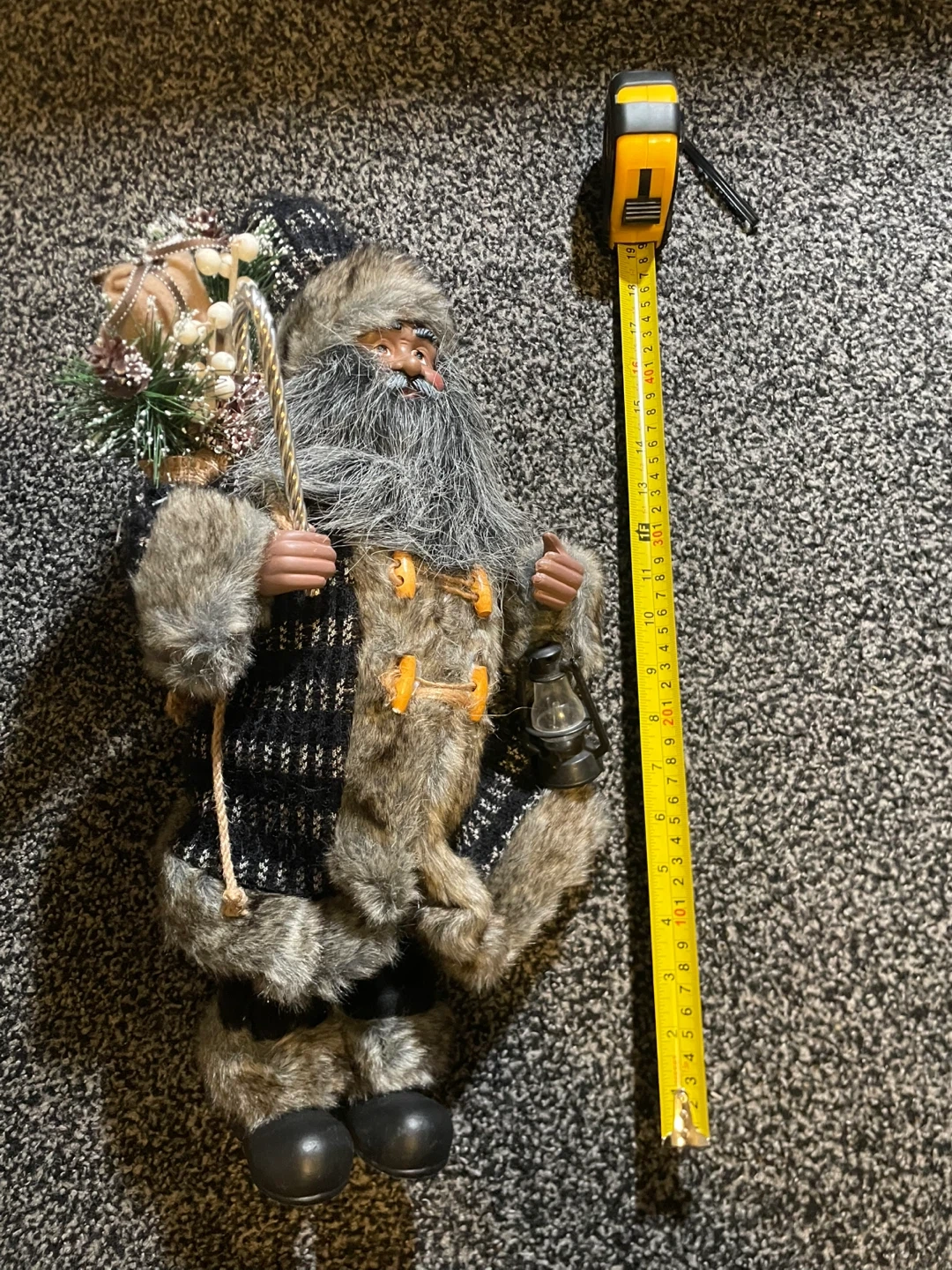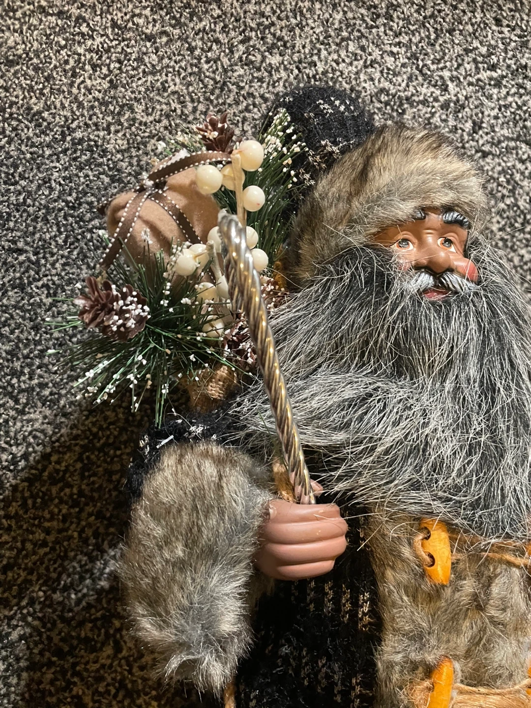 This is a Santa Claus figurine dressed in a furry outfit with a black and white knit hat. He is holding a lantern and a bag with decorations. It measures about 19 inches tall. It’s in good condition!