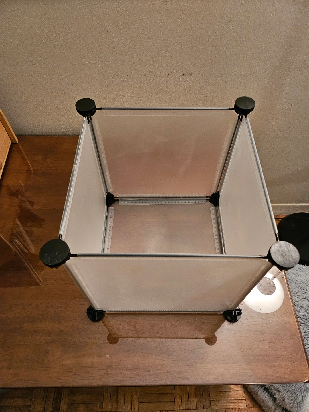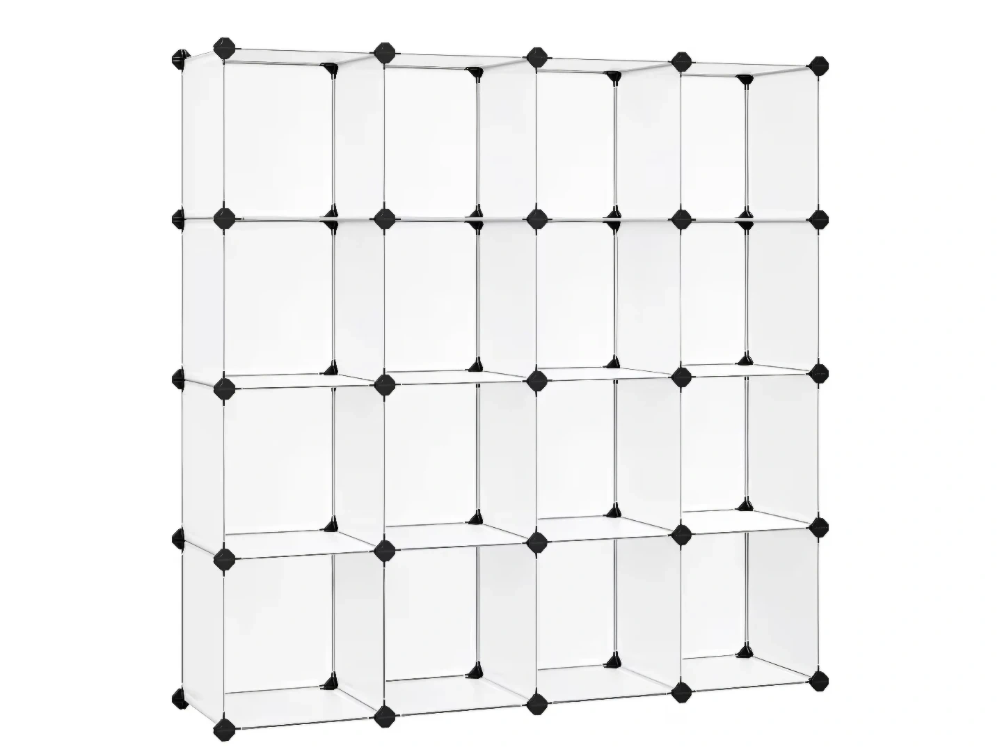 The panels are a sturdy plastic, with metal wire frames, and plastic ABS connectors. There are enough panels and connectors to make 16 storage cubes.