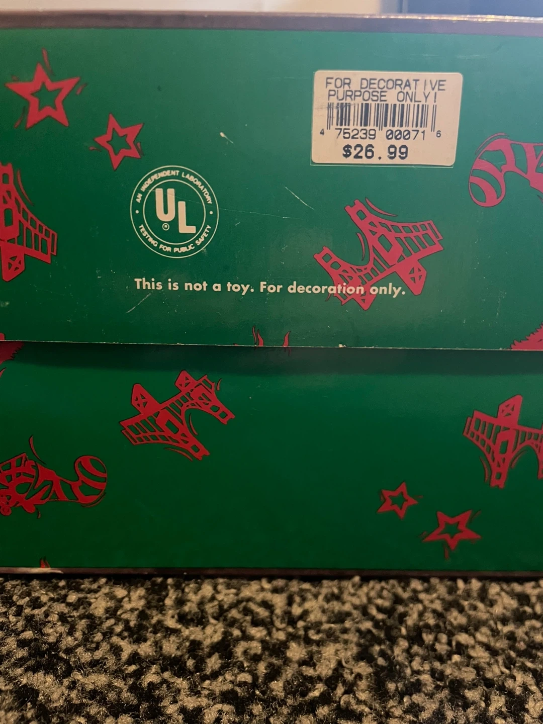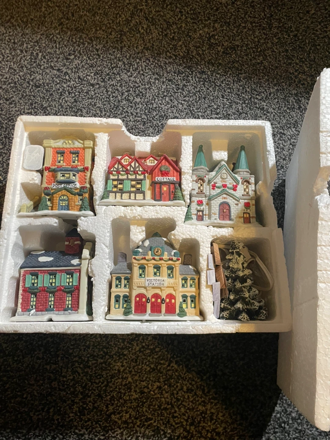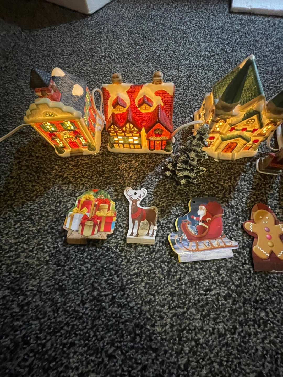 Selling a Village Square 5 piece lighted house set. It comes with the original box and is in good condition! Originally bought for $26.99. Comes with 5 houses that all light up, comes with small figurines like chairs, trees, etc!