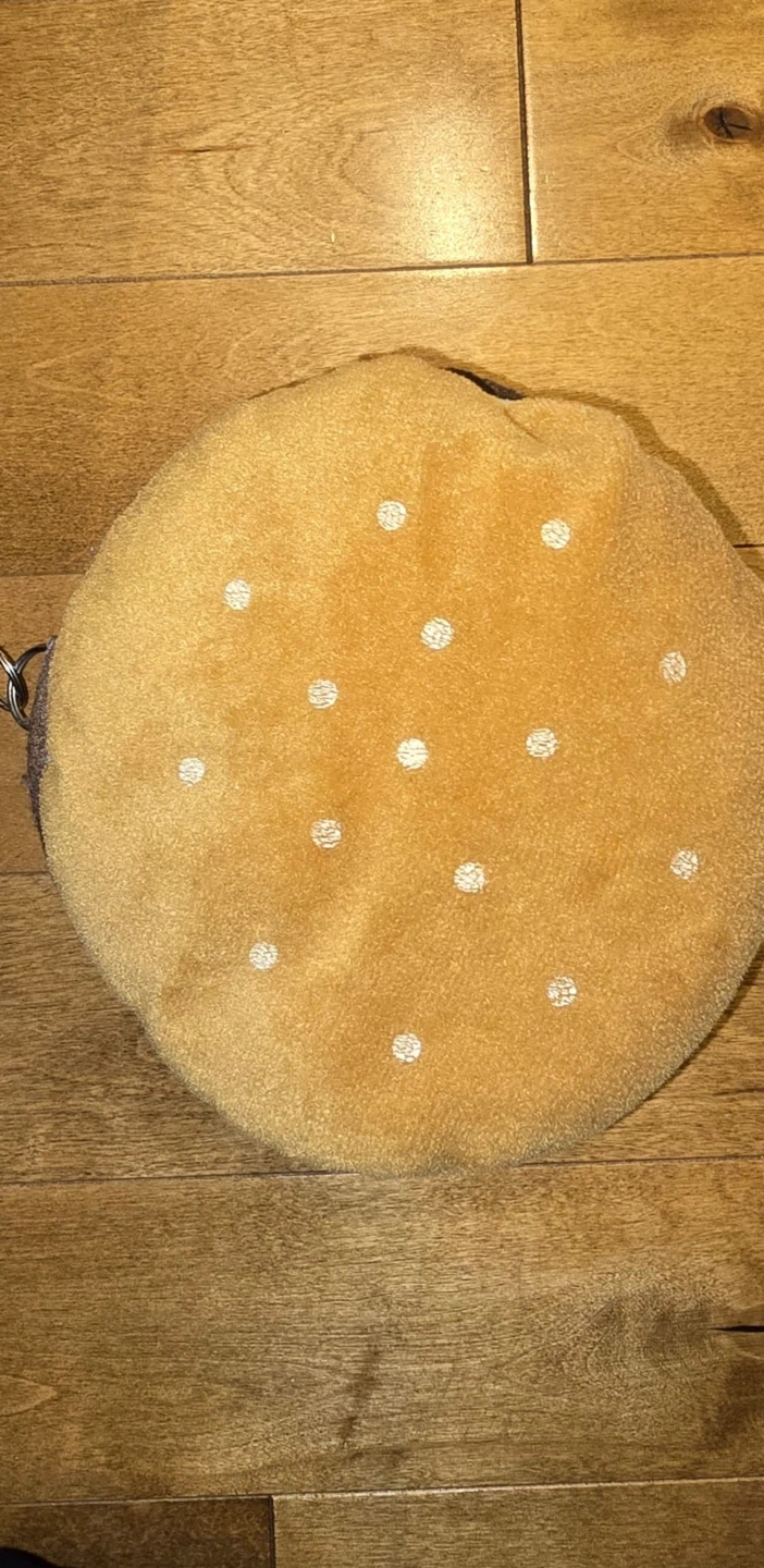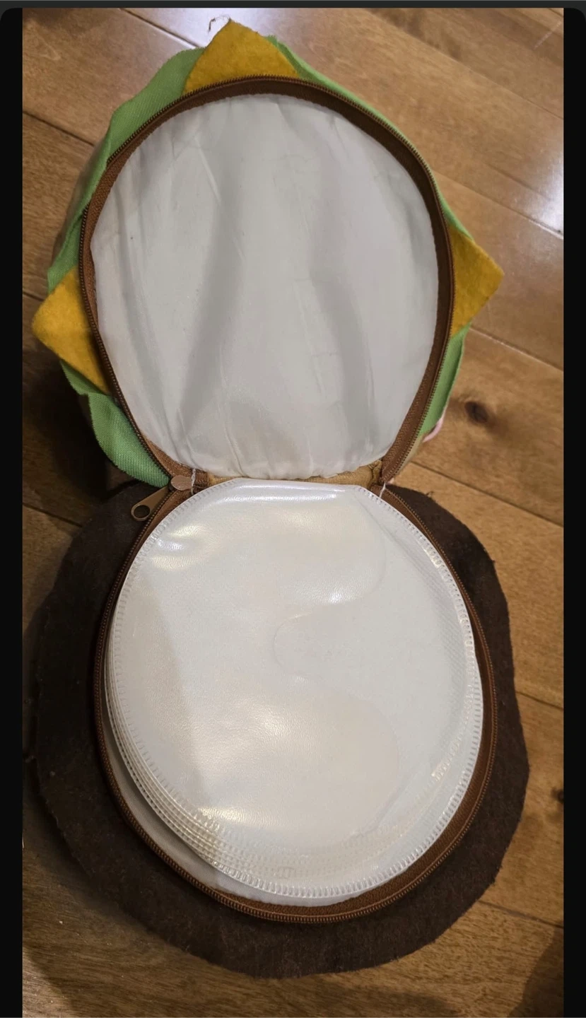 This is a cute burger plushie Disc Case! It has a zipper and when you open it up, it can hold 24 discs inside.