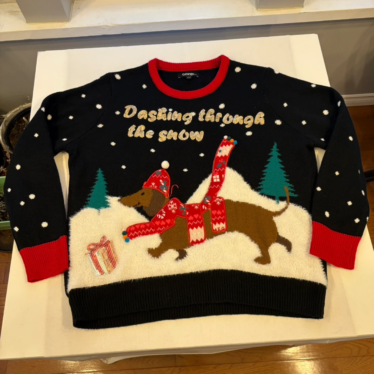 George Black Ugly Christmas Sweater in size Large. Features an adorable Dachshund dog applique with 3D elements, fluffy snow details, and gold sequin text that reads "Dashing through the snow." Perfect for holiday parties and events.