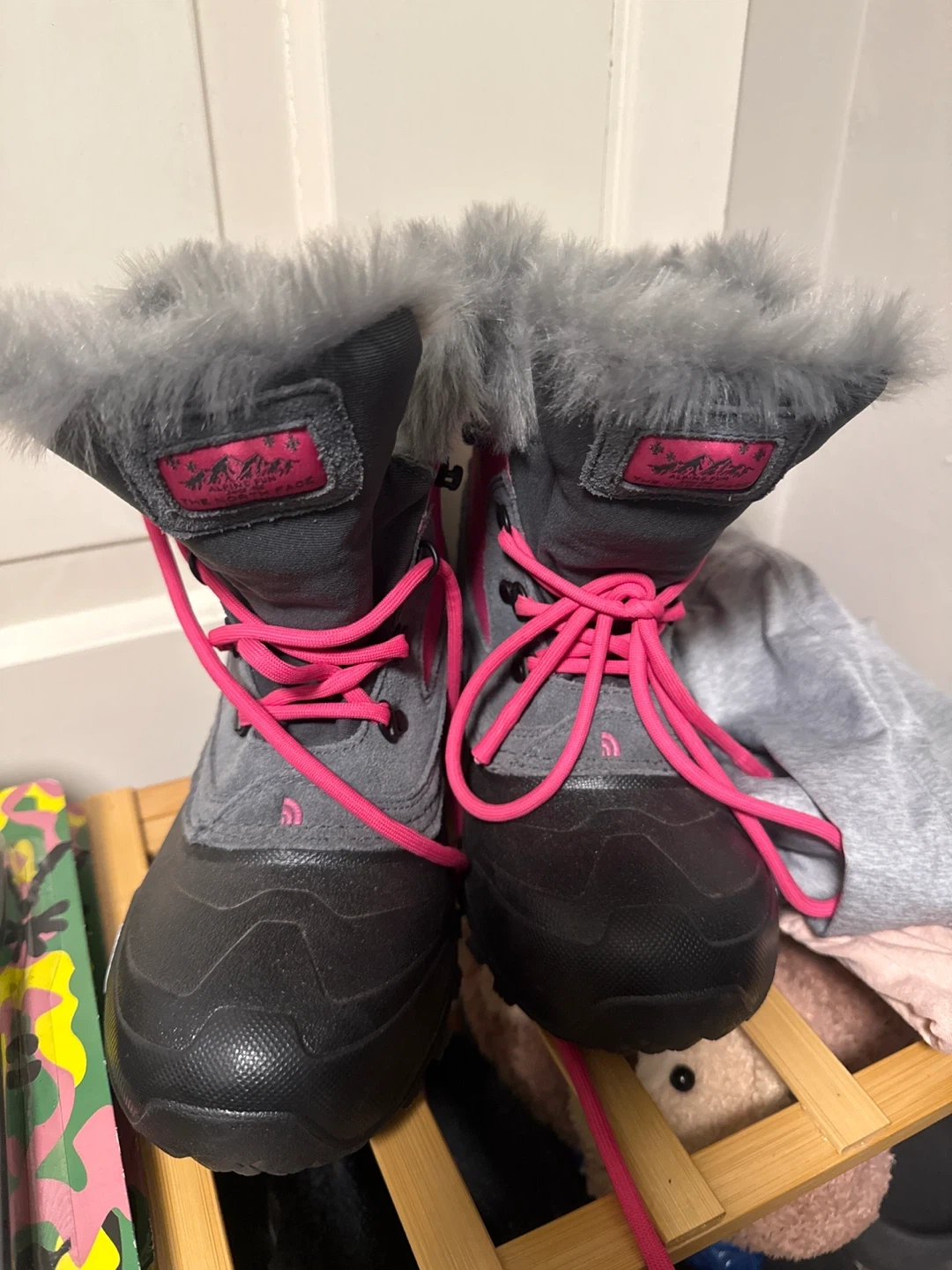 Selling a pair of The North Face snow boots in US size 7. They are in good condition and ready for winter adventures! They feature a grey and black design with pink laces and faux fur trim