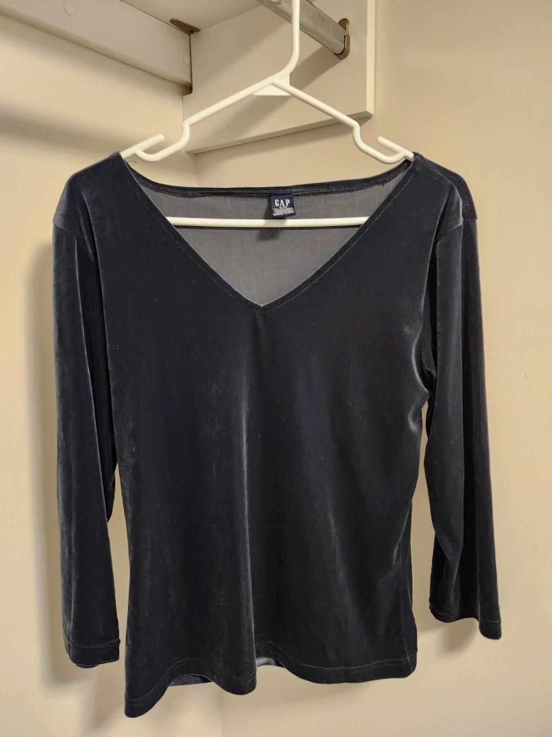 Selling a near new lovely midnight blue velvet long sleeve top from GAP! Worn only once. Perfect for special holiday occasions. Will include for free 6 pieces of costume jewelry (bracelets). Size tag says Large but fits more like a Medium.