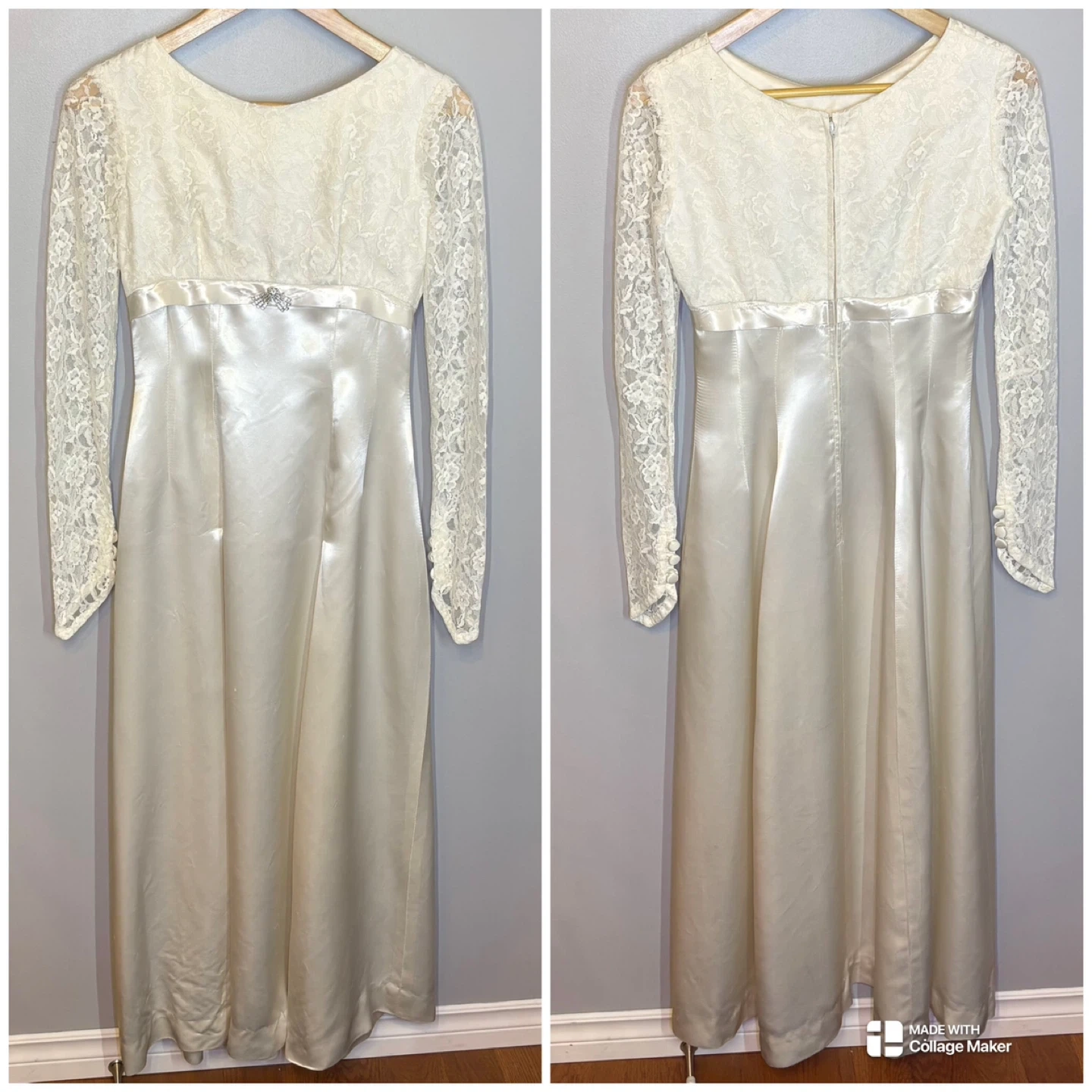 Vintage Wedding Dress, 1960s, 1966, Handmade, Lace, Satin, Maxi Dress, Empire Waist, Bridal Gown, Retro, Cream, Ivory, Rhinestone Brooch, Mod, Long Sleeve, Boho