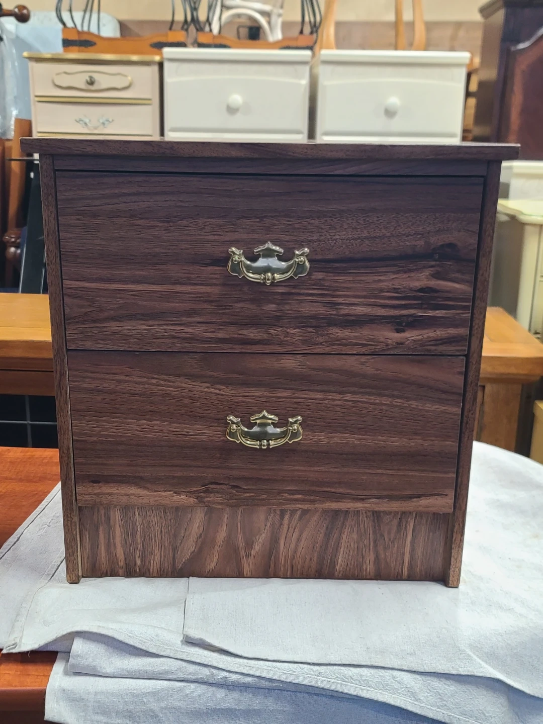 A lovely wood bedside table. It has two drawers, perfect for storing your nighttime essentials. The dark wood finish and brass-toned handles give it a classic look. It's in great condition and ready for a new home! Measurements to follow. Delivery can be arranged. Viewing and pickup by appointment.