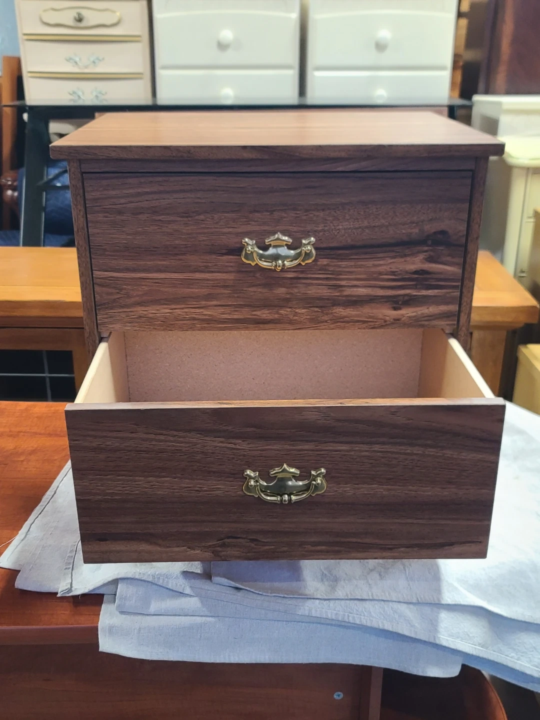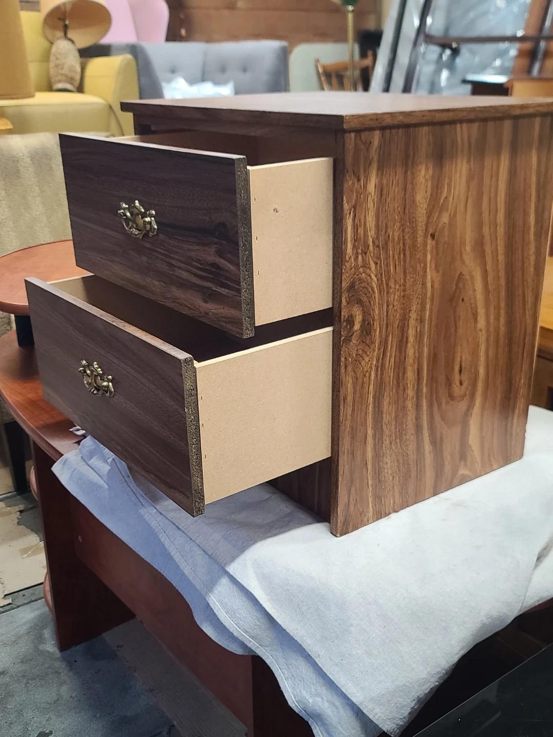 A lovely wood bedside table. It has two drawers, perfect for storing your nighttime essentials. The dark wood finish and brass-toned handles give it a classic look. It's in great condition and ready for a new home! Measurements to follow. Delivery can be arranged. Viewing and pickup by appointment.