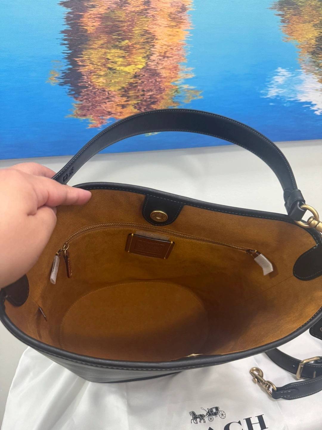 Large size; Selling a Coach black leather bucket bag! It's in excellent condition and comes with 2 straps that are detachable. Perfect for everyday use!