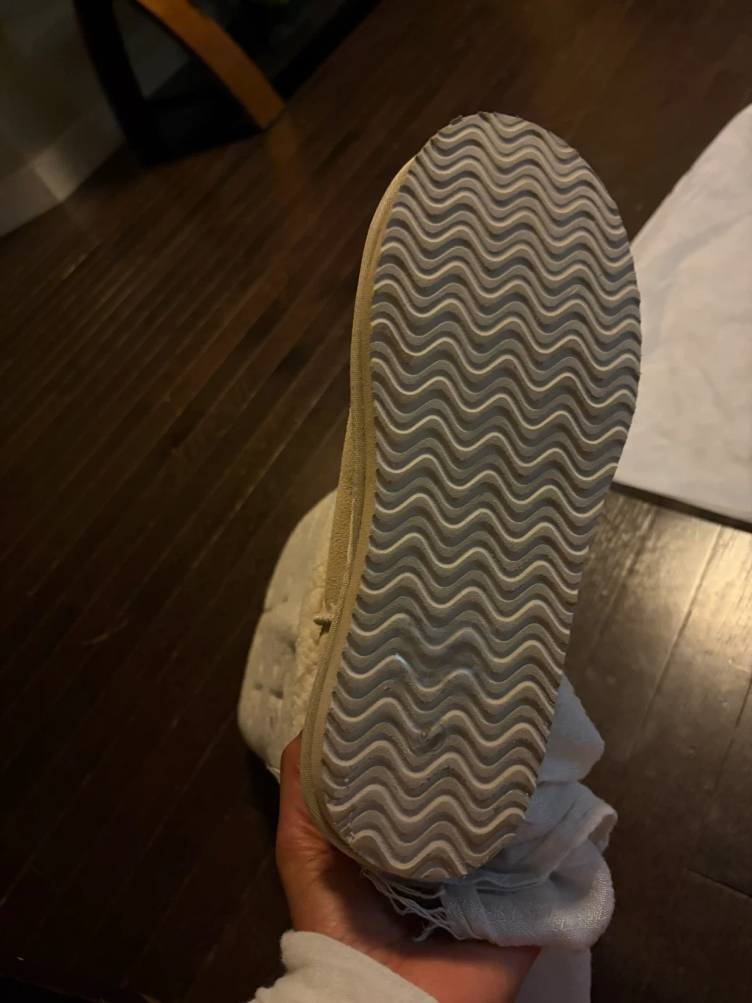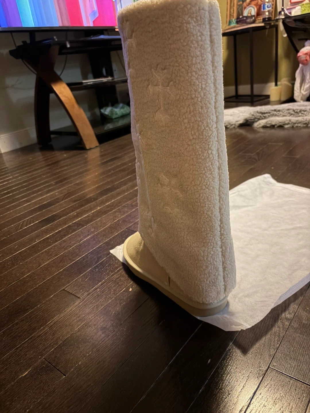 Selling a pair of Chrome Hearts tall boots. They are a beige colour with shearling and cross designs. The soles have a wavy pattern. These boots are perfect for the winter season!