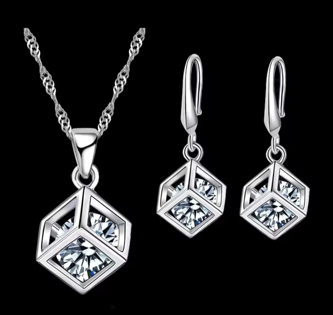 Selling a beautiful matching necklace and earrings set! The set features a silver chain necklace with a cube pendant and matching cube earrings. The cubes have a sparkling stone inside. Perfect for adding a touch of elegance to any outfit!
