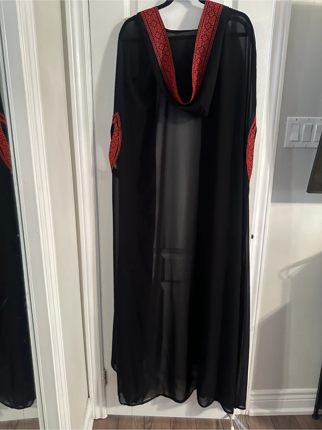 Selling a beautiful black sheer cape with red embroidery. It's brand new and perfect for layering or special occasions!