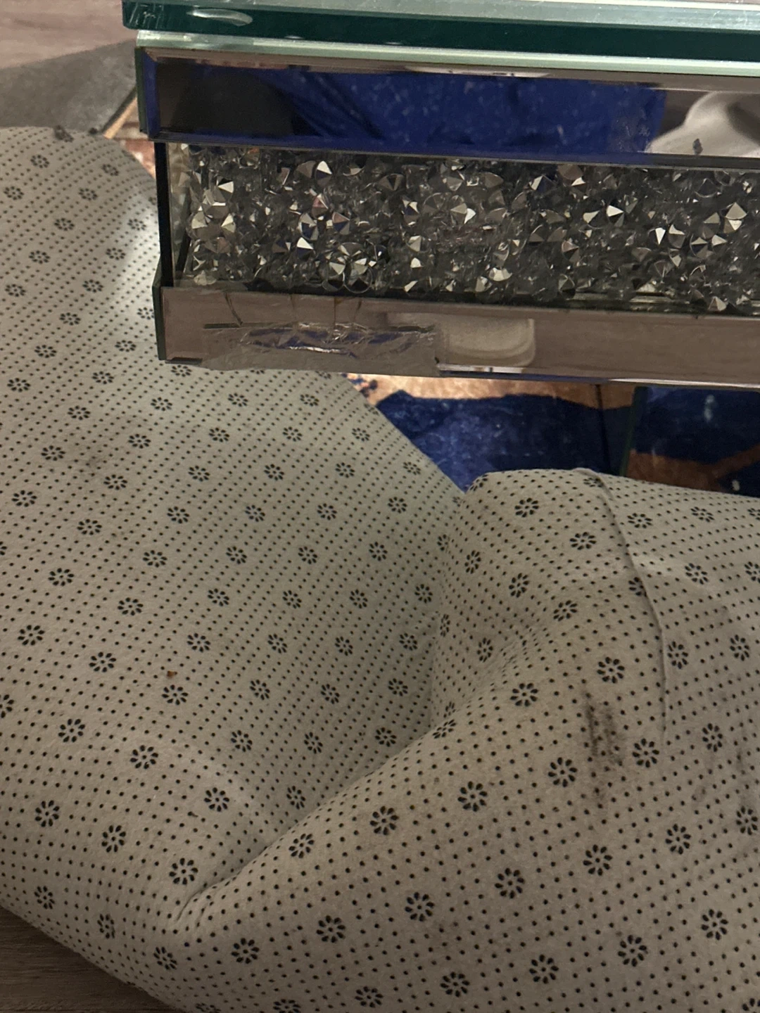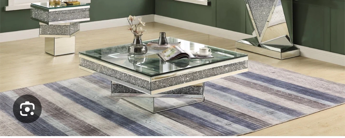 This is a silver metal coffee table with diamond look legs. It's great for small spaces and would be a hot buy for anyone looking to add a touch of glam to their living room. Originally listed for $649.95!