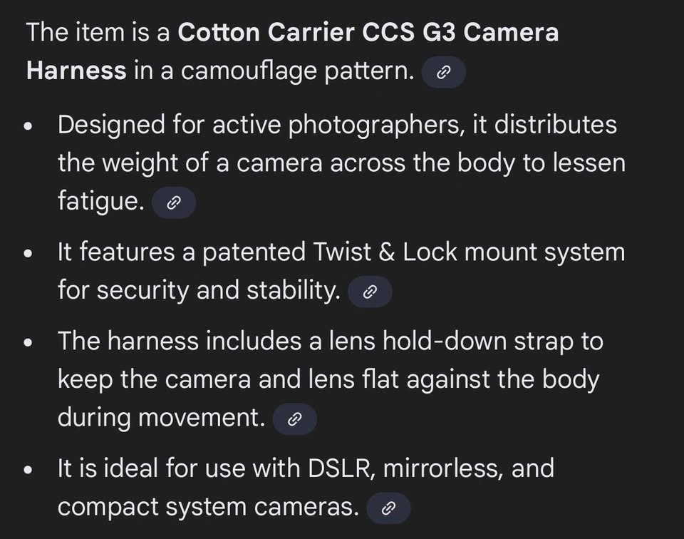 The item is a Cotton Carrier CCS G3 Camera Harness in a camouflage pattern.