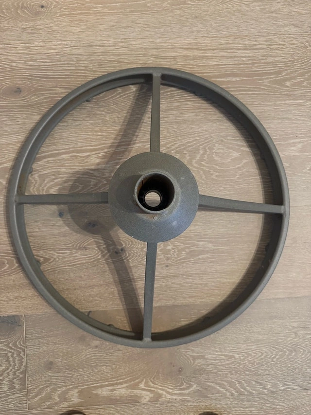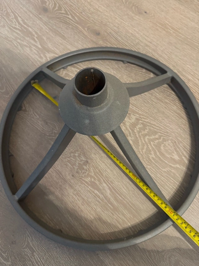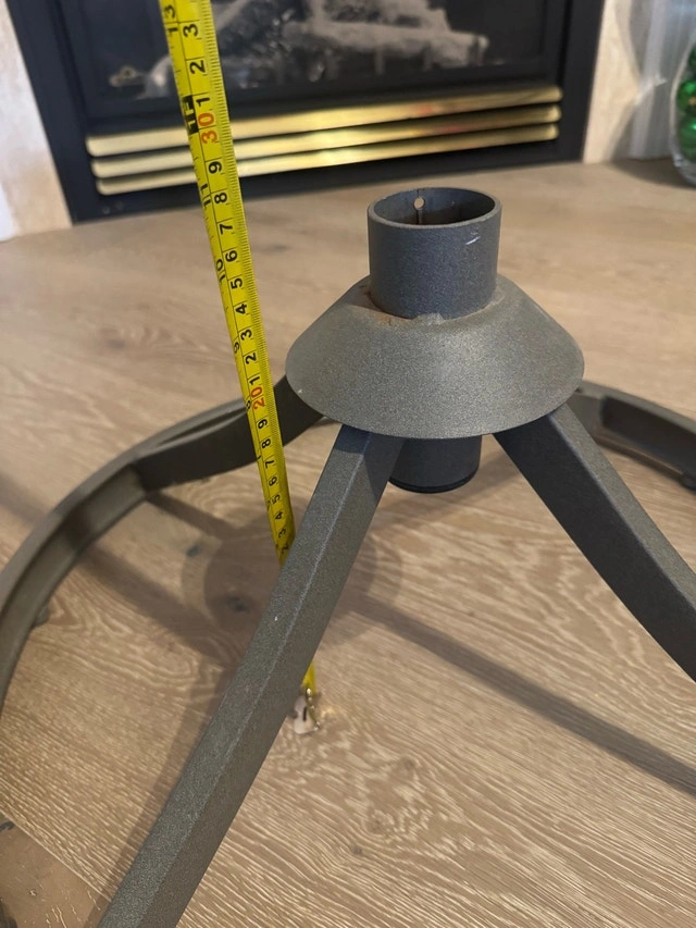 This is a sturdy Christmas tree stand in used condition, ready to hold your festive tree. It's designed for stability and easy setup. The stand has a diameter of approximately 18 inches and a centre hole of 2.5 inches. If the ad is still up, it's available!