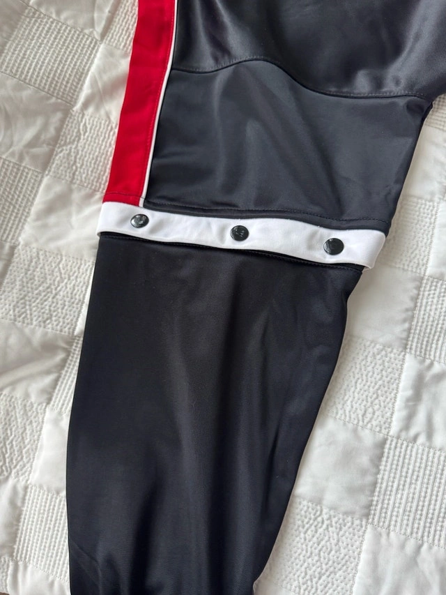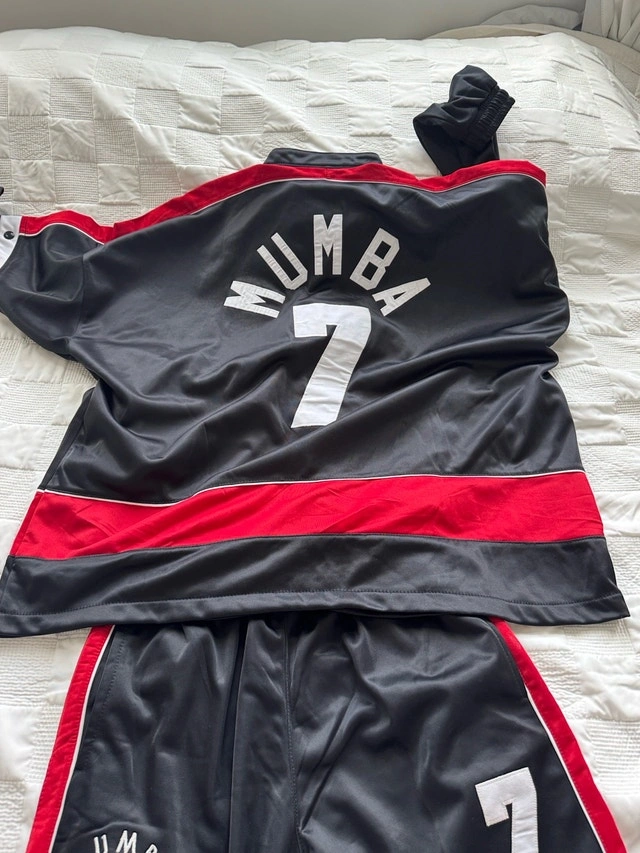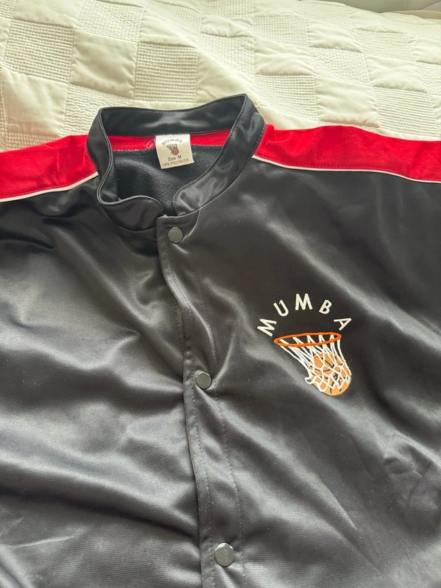 Get ready to hit the court in style with this Mumba black and red basketball uniform suit. The set includes a jacket and pants. This basketball suit is in good used condition, ready for its next game.