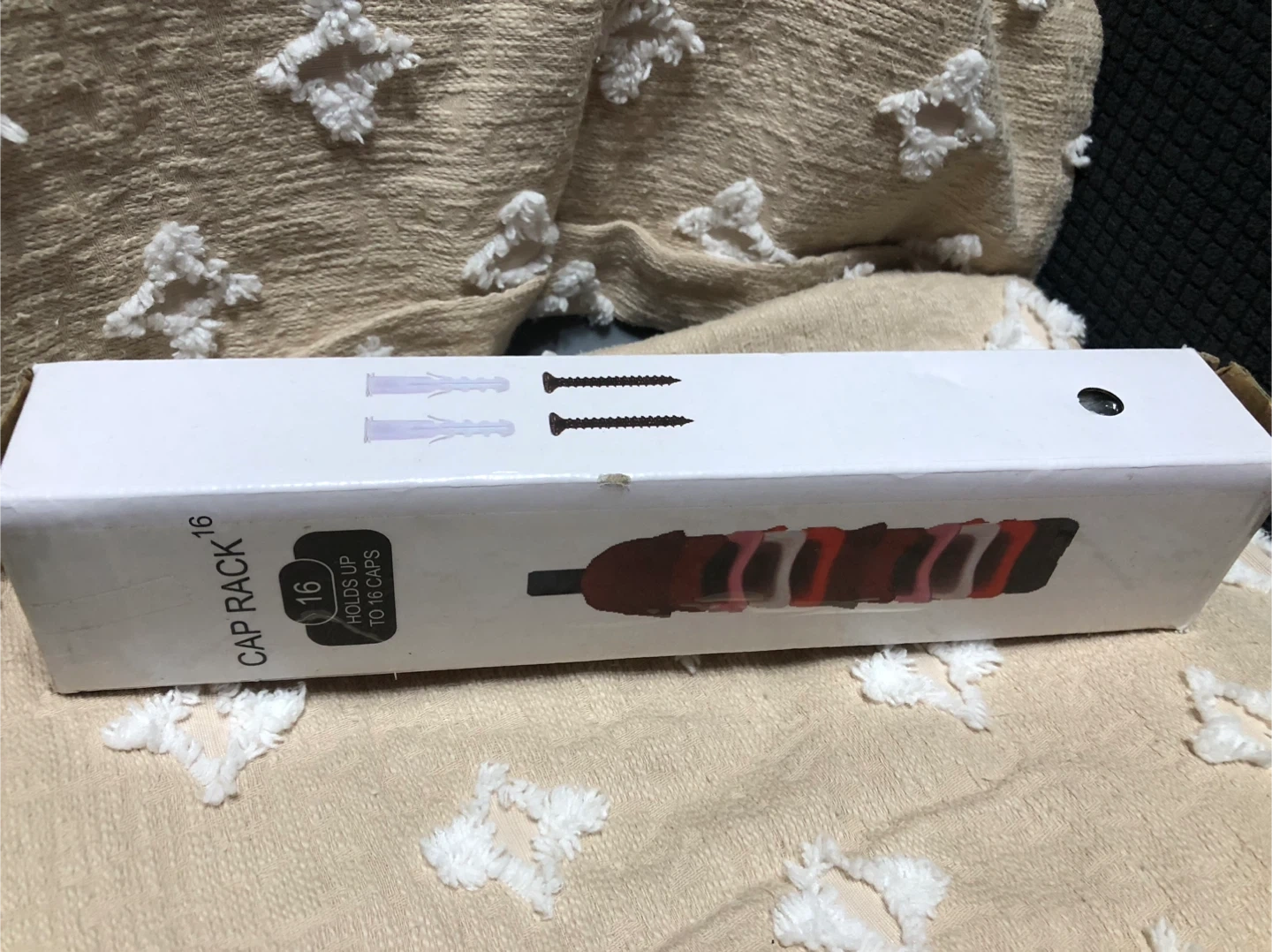 Selling a cap rack that can hold up to 16 caps! It's in great condition and comes with the original box and mounting hardware!