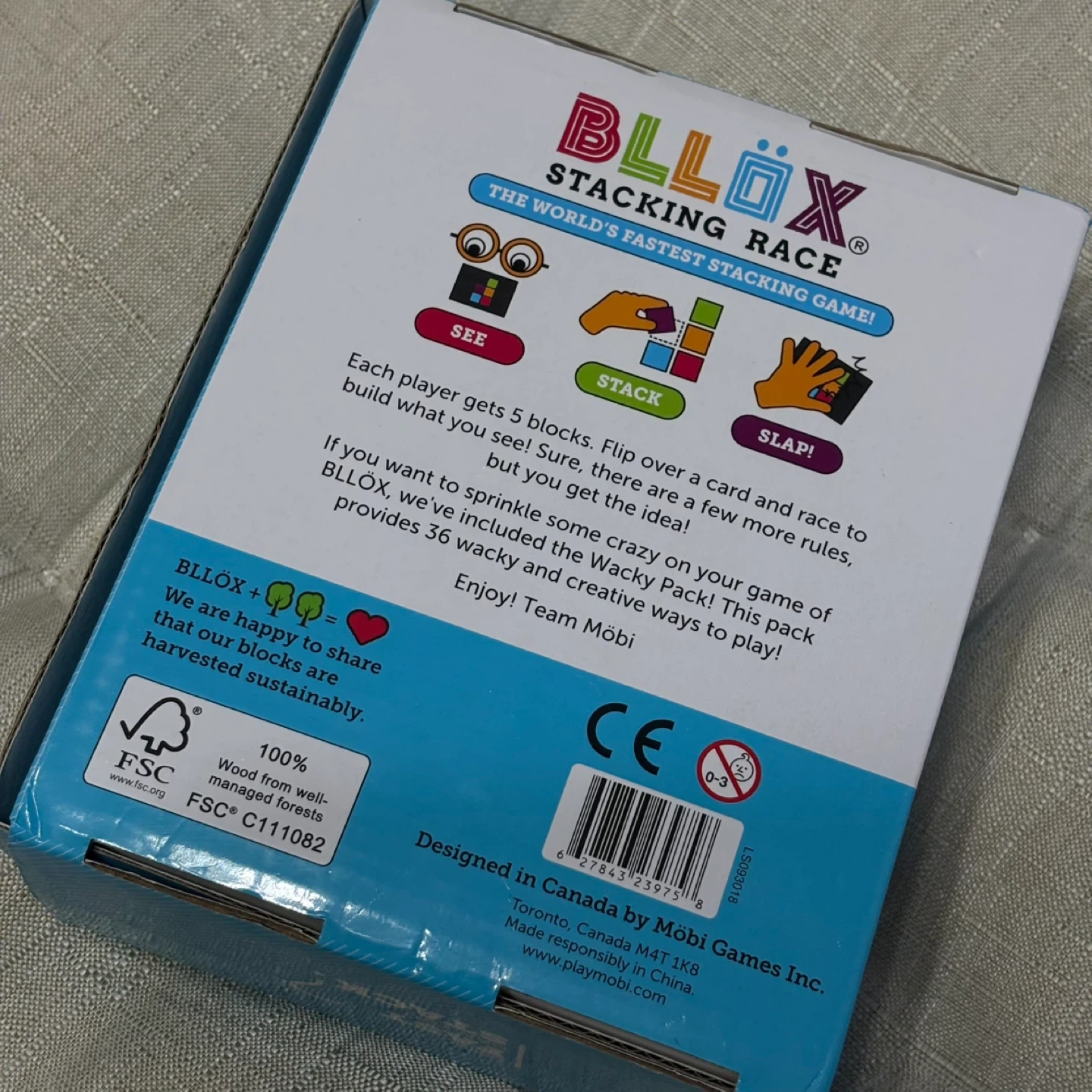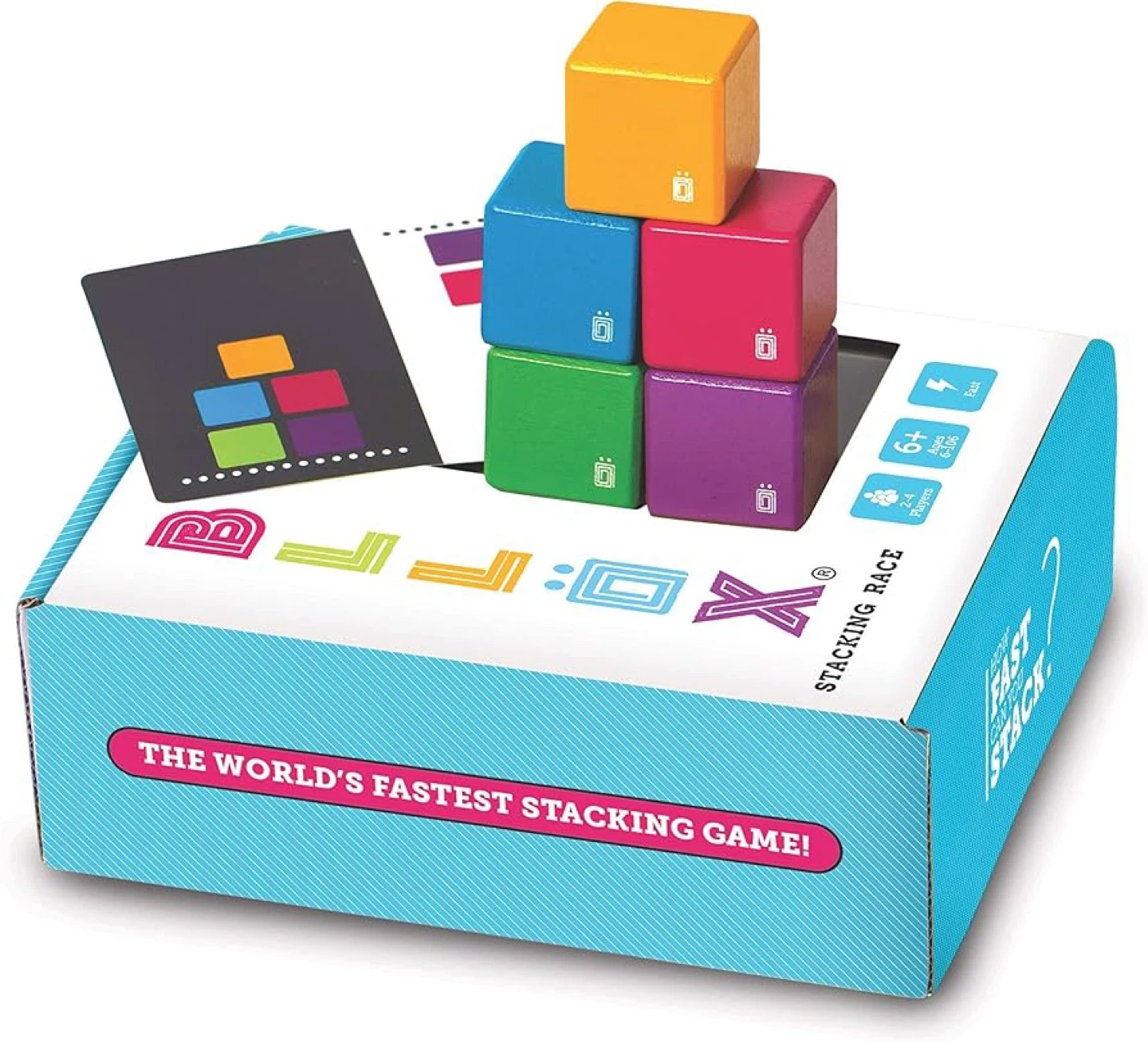 Get ready for a fast-paced stacking challenge with BLLÖX! This game from möbi is designed for 2+ players and is suitable for ages 6 and up. It's the world's fastest stacking game! Each player gets 5 blocks and races to build what they see on the card. The box includes 36 wacky and creative ways to play with the Wacky Pack!