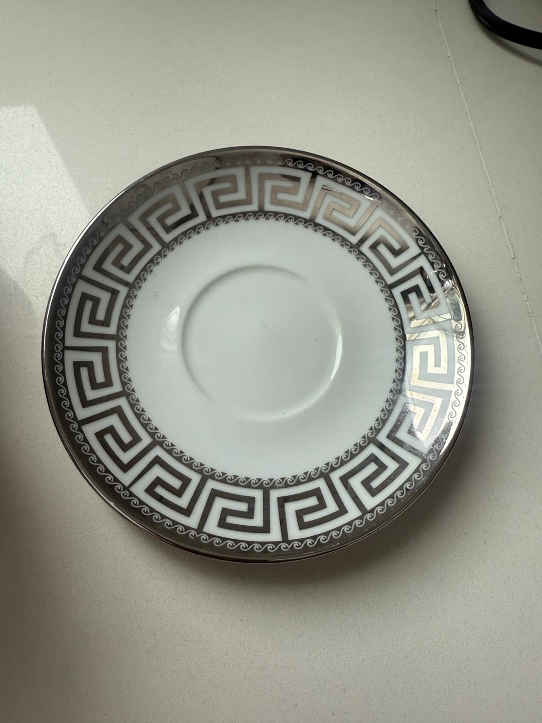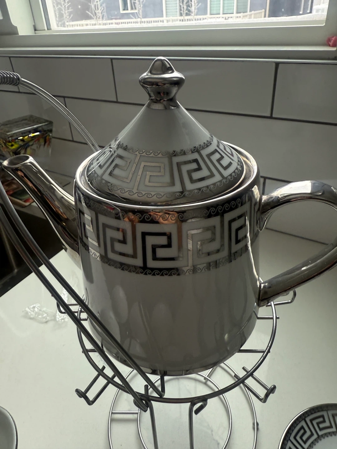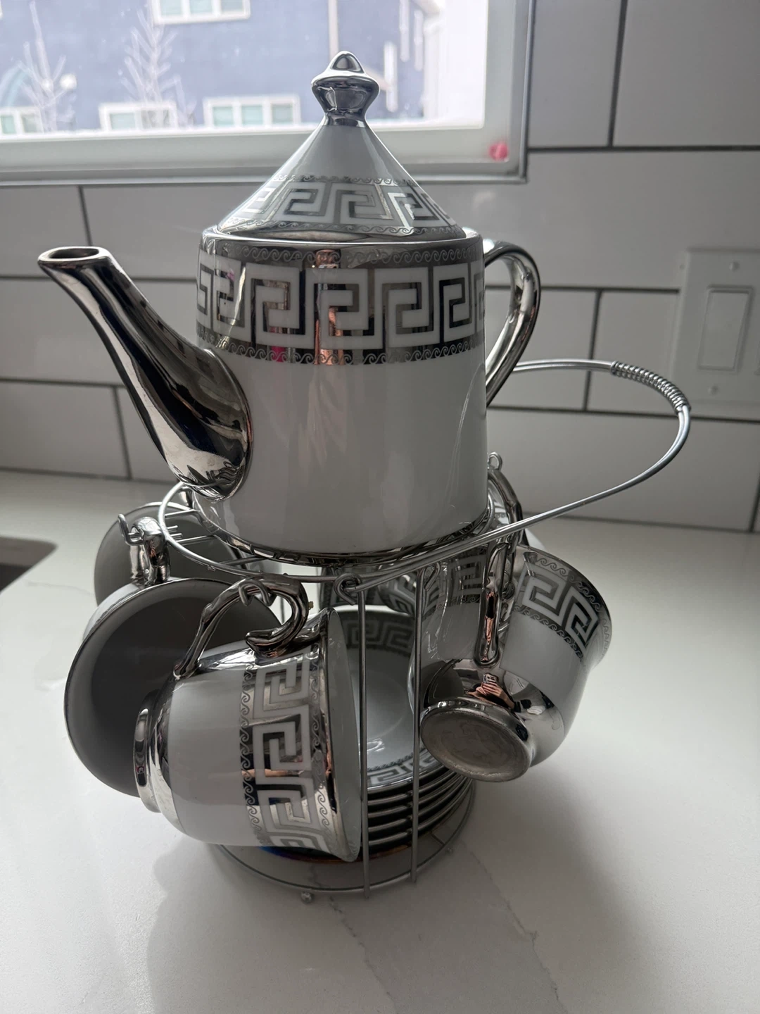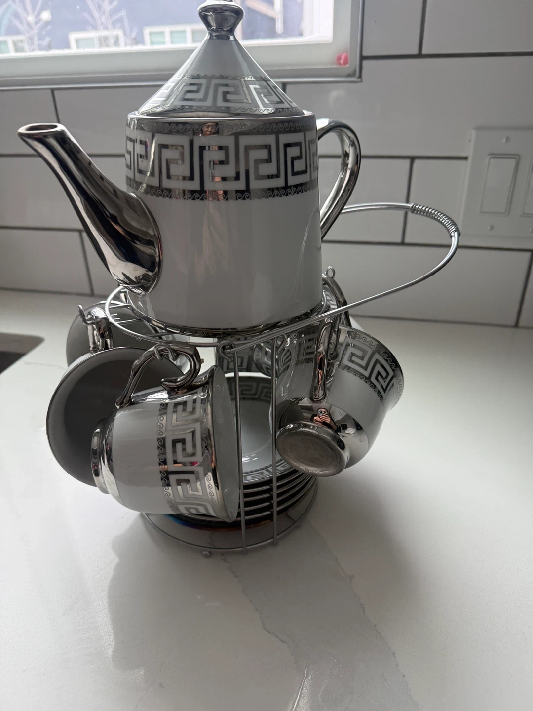 Selling a beautiful tea set that includes a teapot, six cups, six saucers, and a convenient stand. The set is white with a silver Greek key design, adding a touch of elegance to any tea party or display! It's in great condition and ready to be enjoyed