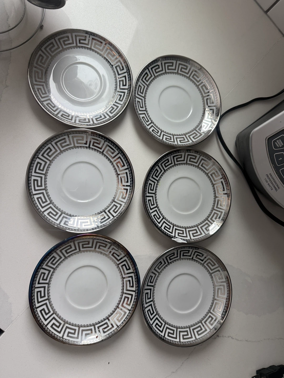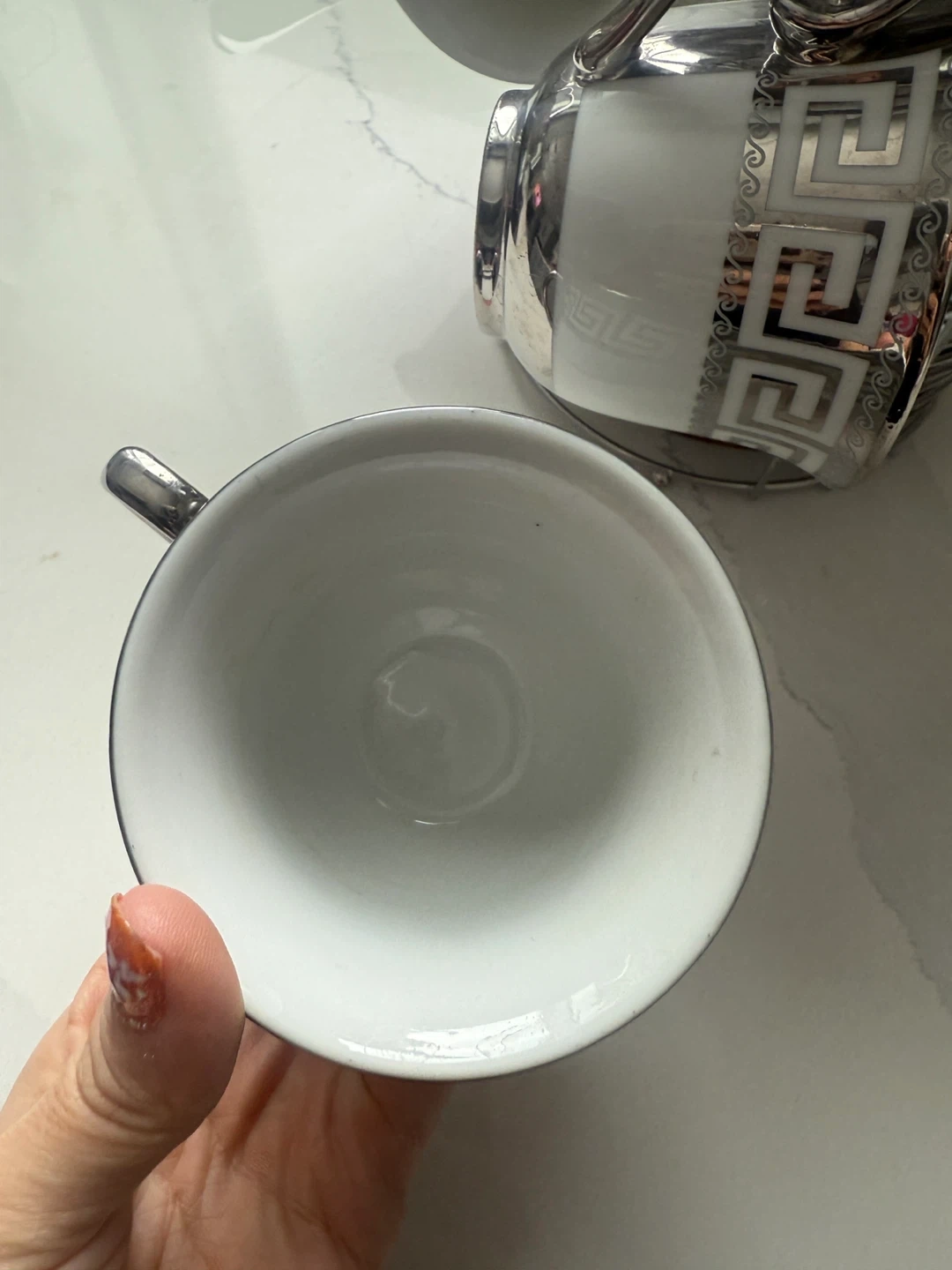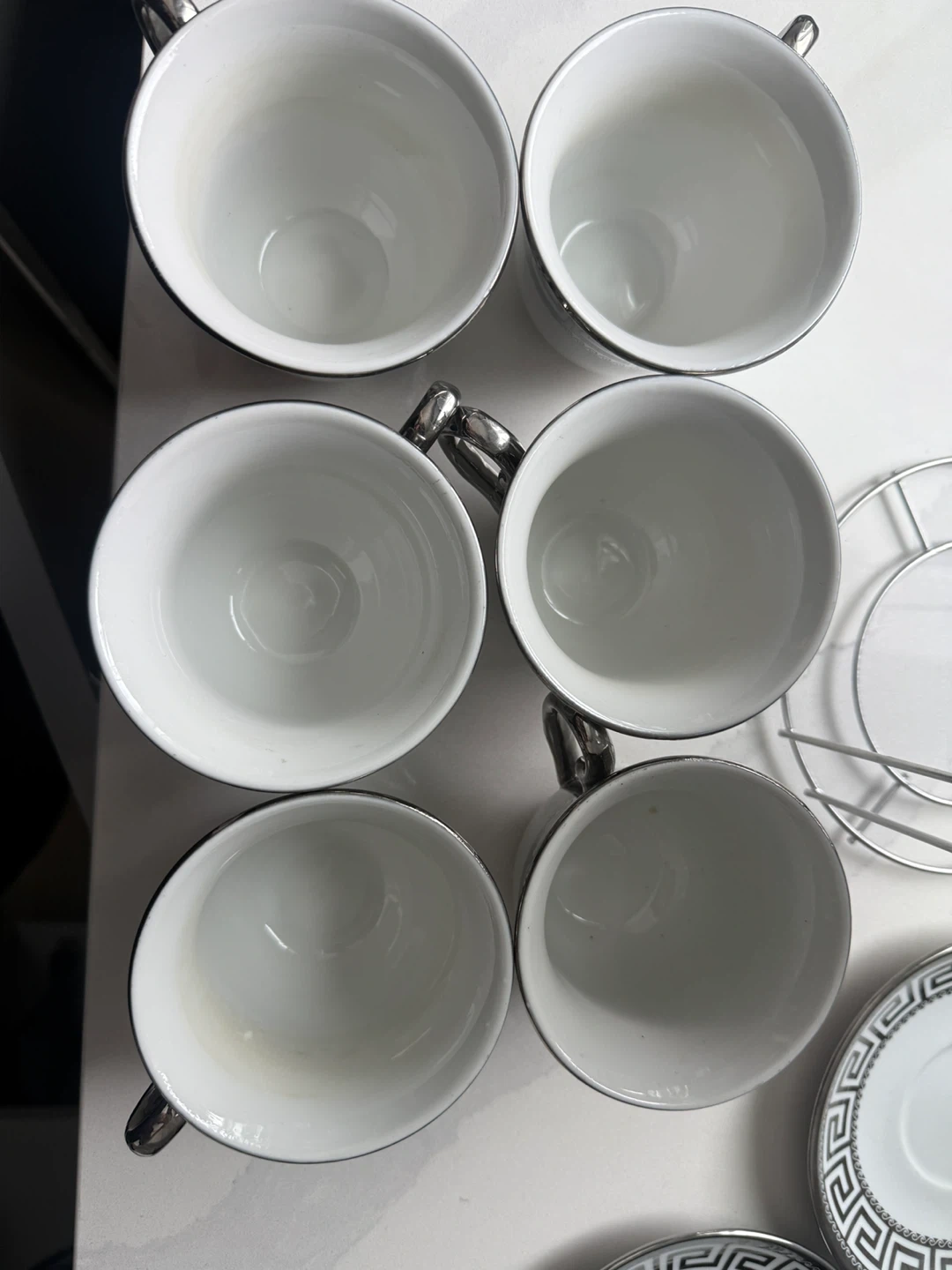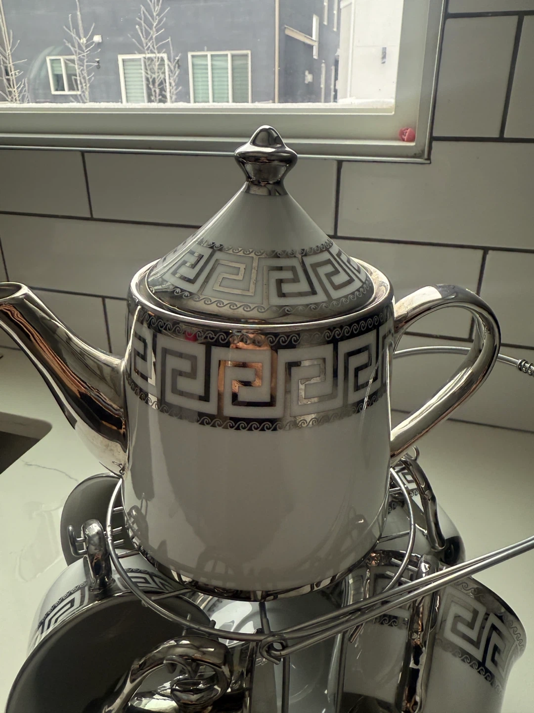 Selling a beautiful tea set that includes a teapot, six cups, six saucers, and a convenient stand. The set is white with a silver Greek key design, adding a touch of elegance to any tea party or display! It's in great condition and ready to be enjoyed