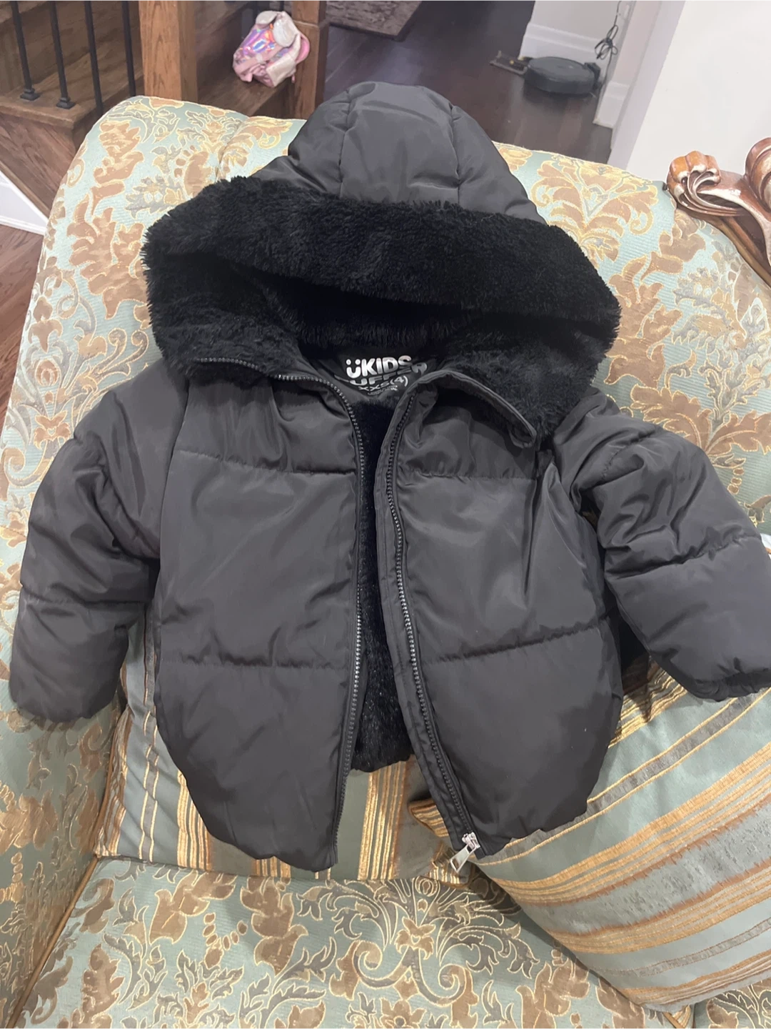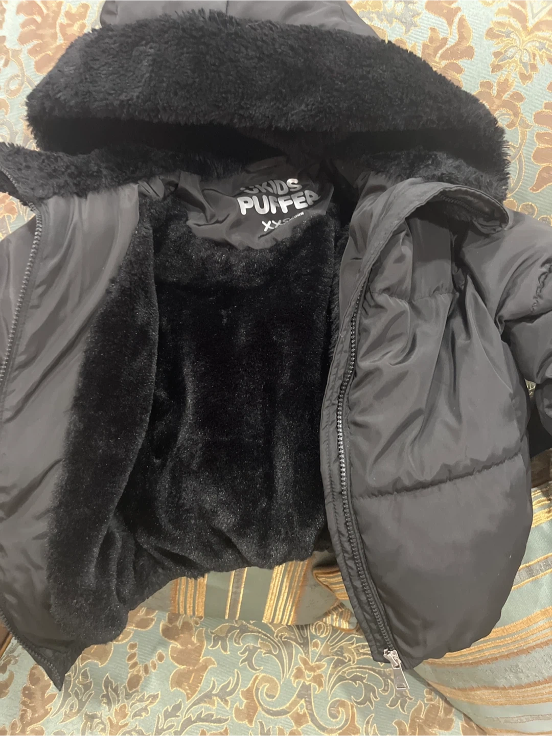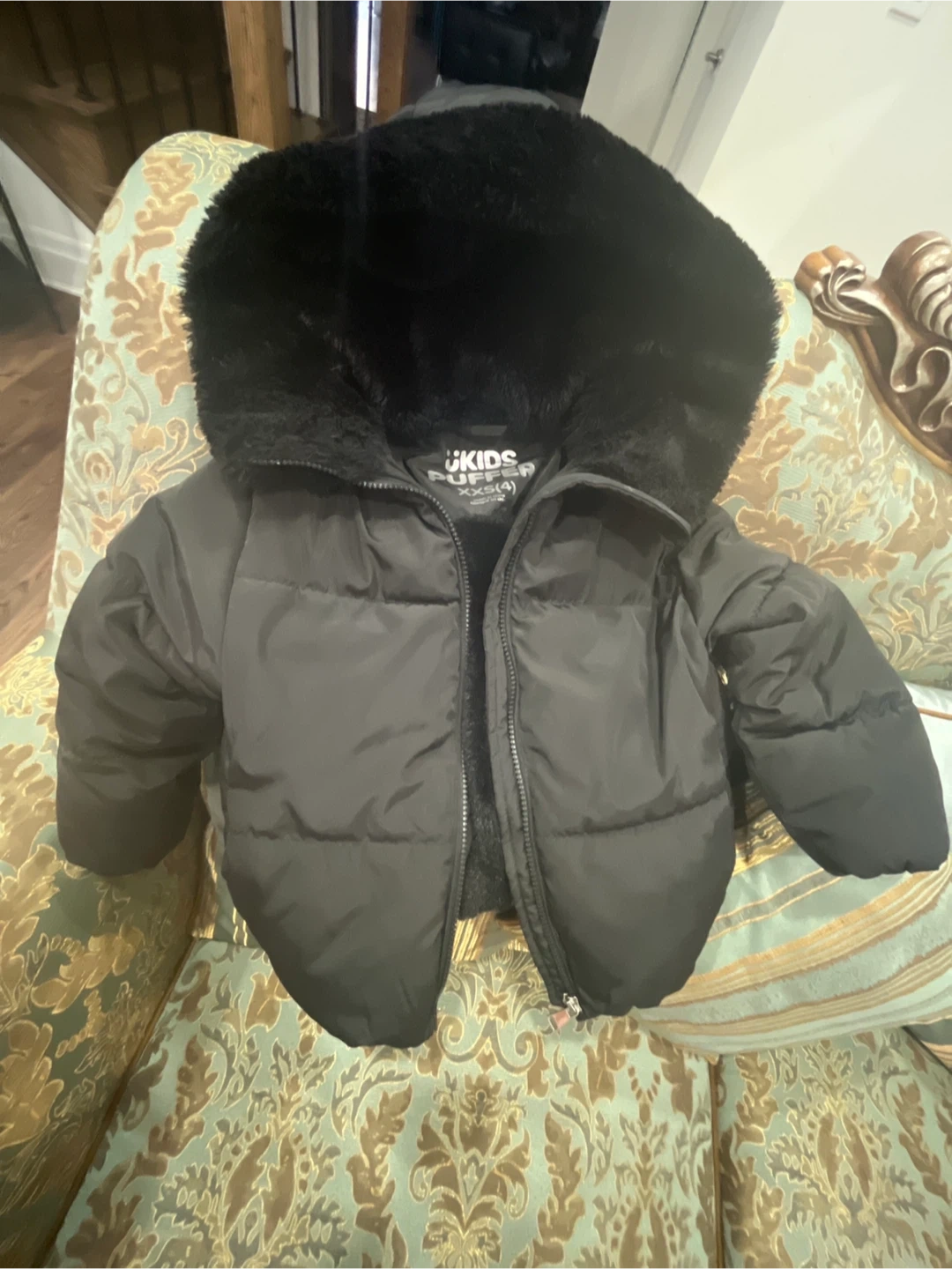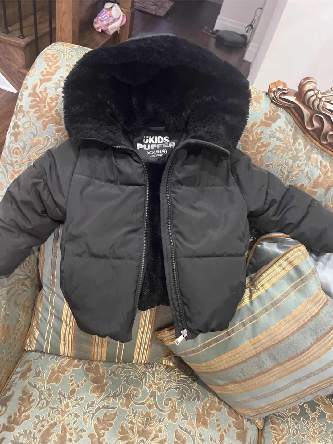Here's a cozy black puffer jacket for kids! It's a size XXS(4) and features a warm, fur-lined hood. Perfect for keeping your little one snug during the colder months