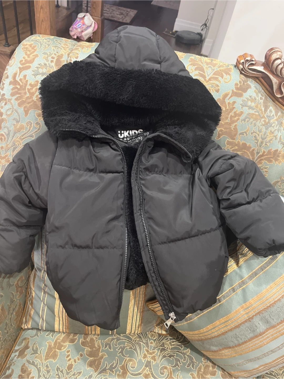 Here's a cozy black puffer jacket for kids! It's a size XXS(4) and features a warm, fur-lined hood. Perfect for keeping your little one snug during the colder months