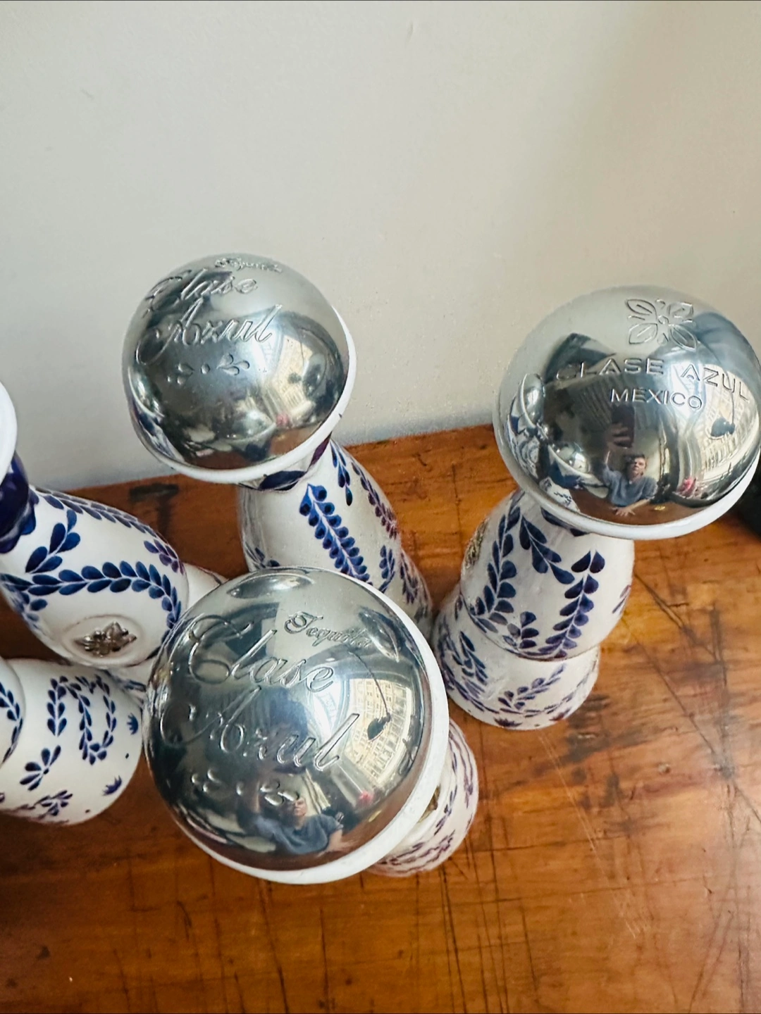 Clase Azul bottles are iconic, handcrafted ceramic decanters, hand-painted by Mexican artisans, featuring distinctive cobalt blue feathered designs (especially the popular Reposado) or other unique art, with a signature bell-shaped top making them highly collectible and reusable as vases or decor, showcasing Mexican culture and craftsmanship.