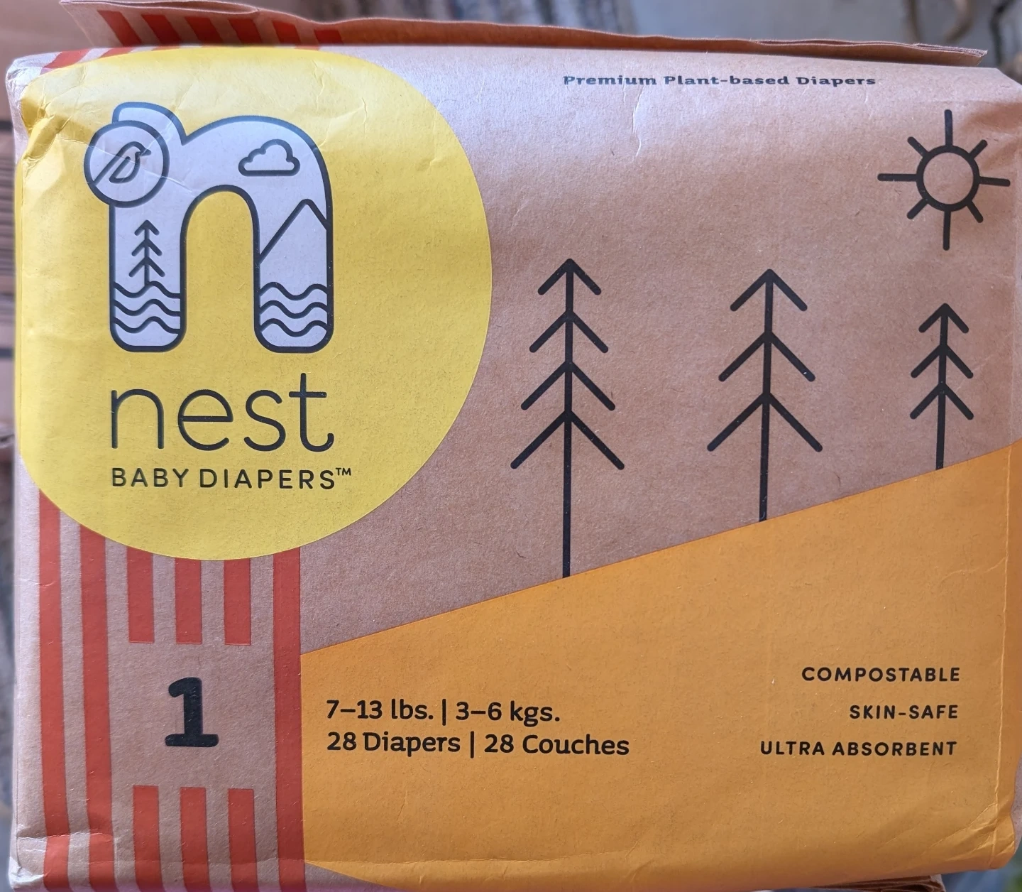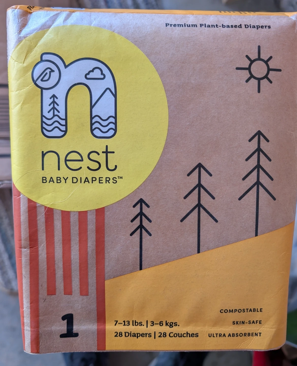 Selling a pack of Nest Baby Diapers, size 1. These are premium plant-based diapers designed for babies weighing 7-13 lbs (3-6 kgs). The pack contains 28 diapers. They are compostable, skin-safe, and ultra-absorbent, perfect for your little one!