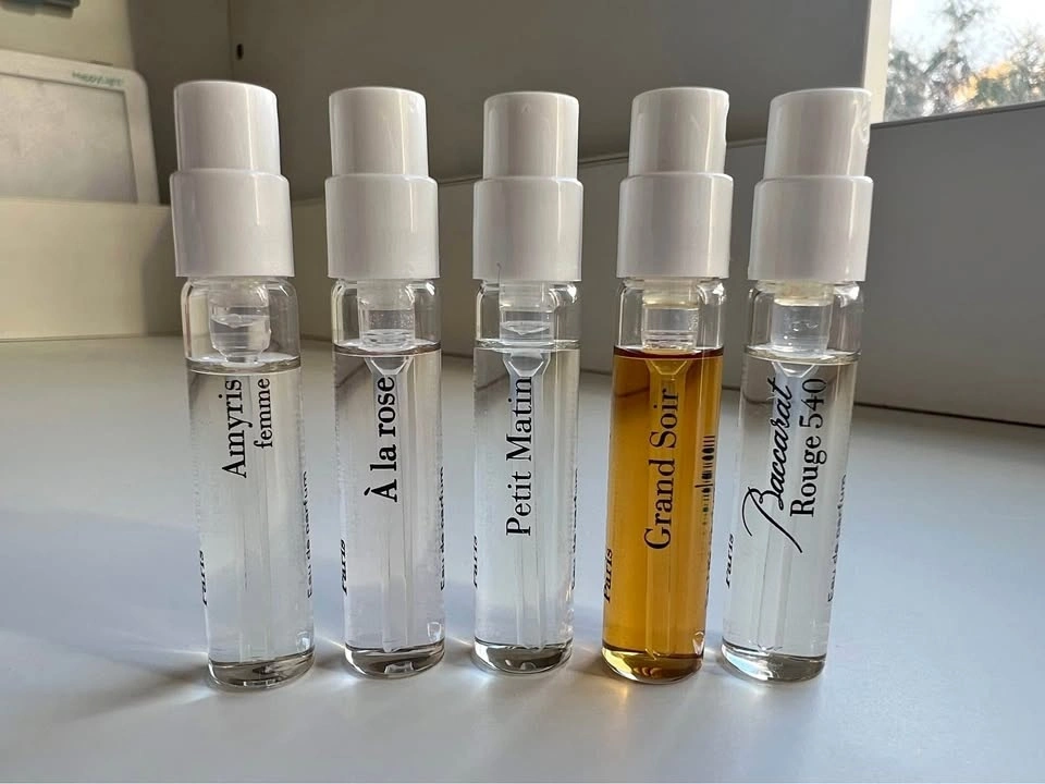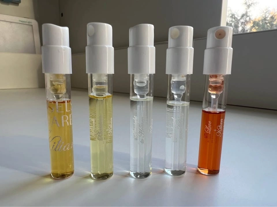 Some have been sprayed once, some are new. You can see how much liquid each bottle has in the pictures. I have the boxes for the Kilian and the M.F.K sets.