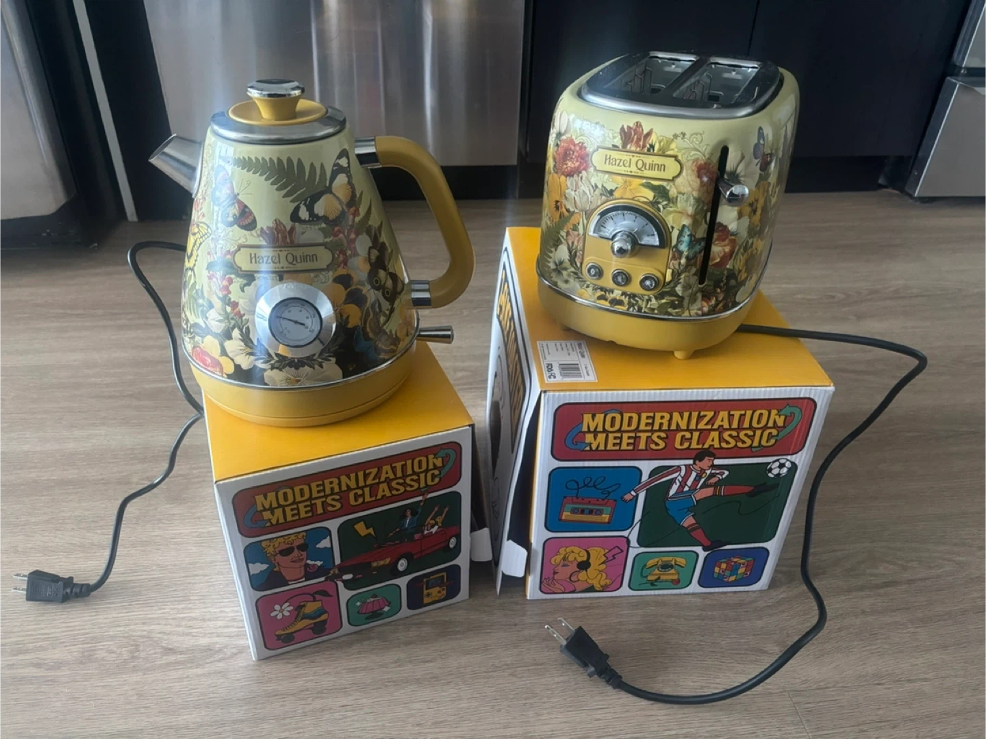 Selling a Hazel Quinn kettle and toaster set. Both are in excellent condition and come with their original boxes. The design is a unique blend of modern and classic styles, adding a touch of vintage charm to your kitchen!