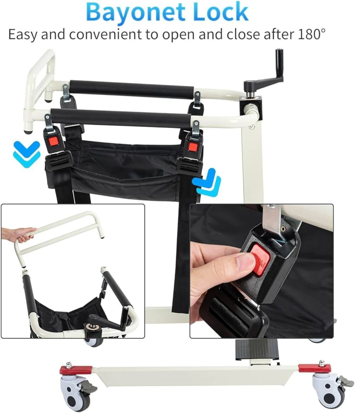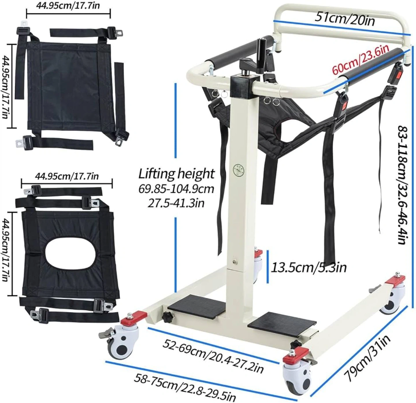 This patient transfer lift is designed for easy and safe mobility. It features universal silent casters with brakes for smooth movement and stability. The adjustable width adapts to different needs, ranging from 57.9-74.93cm / 22.8-29.5in. It also has a soft cushion and a labor-saving device for comfortable and convenient use.