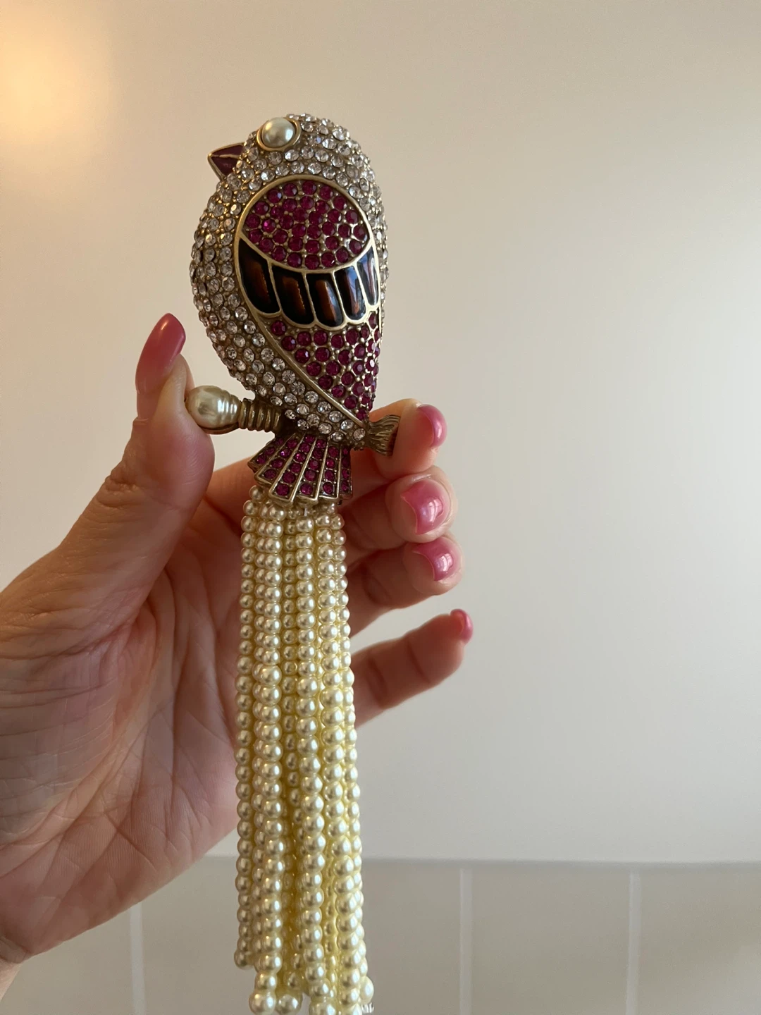 Selling a beautiful bird brooch. It features a bird design adorned with rhinestones and ruby-coloured stones, complete with pearl tassels. It's in great condition and would make a lovely addition to any outfit!