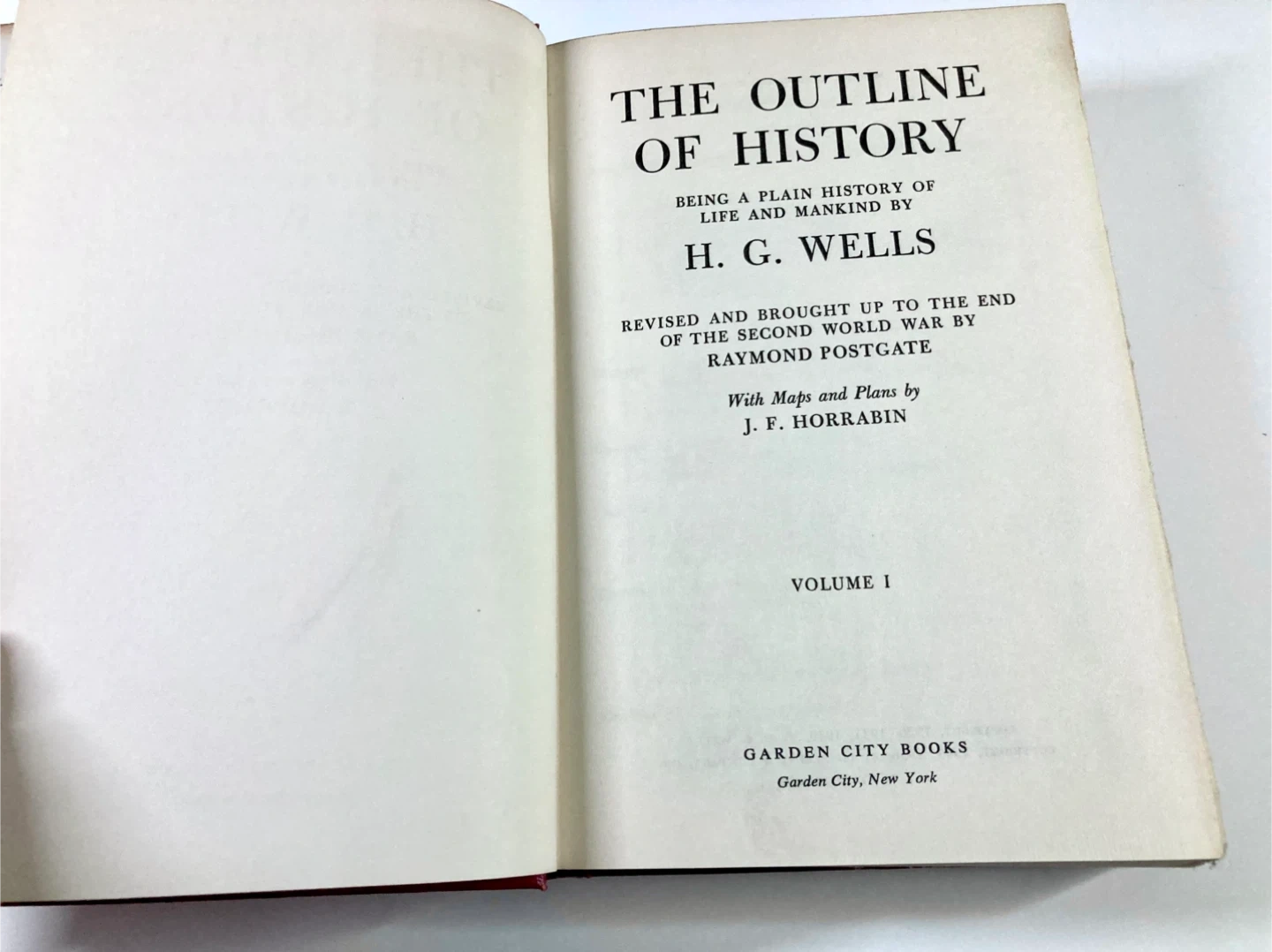 Selling Volume I of "The Outline of History" by H.G. Wells. This edition was revised and brought up to the end of the Second World War by Raymond Postgate. It includes maps and plans by J.F. Horrabin. Printed 1956. Some wear due to its age, in good condition.