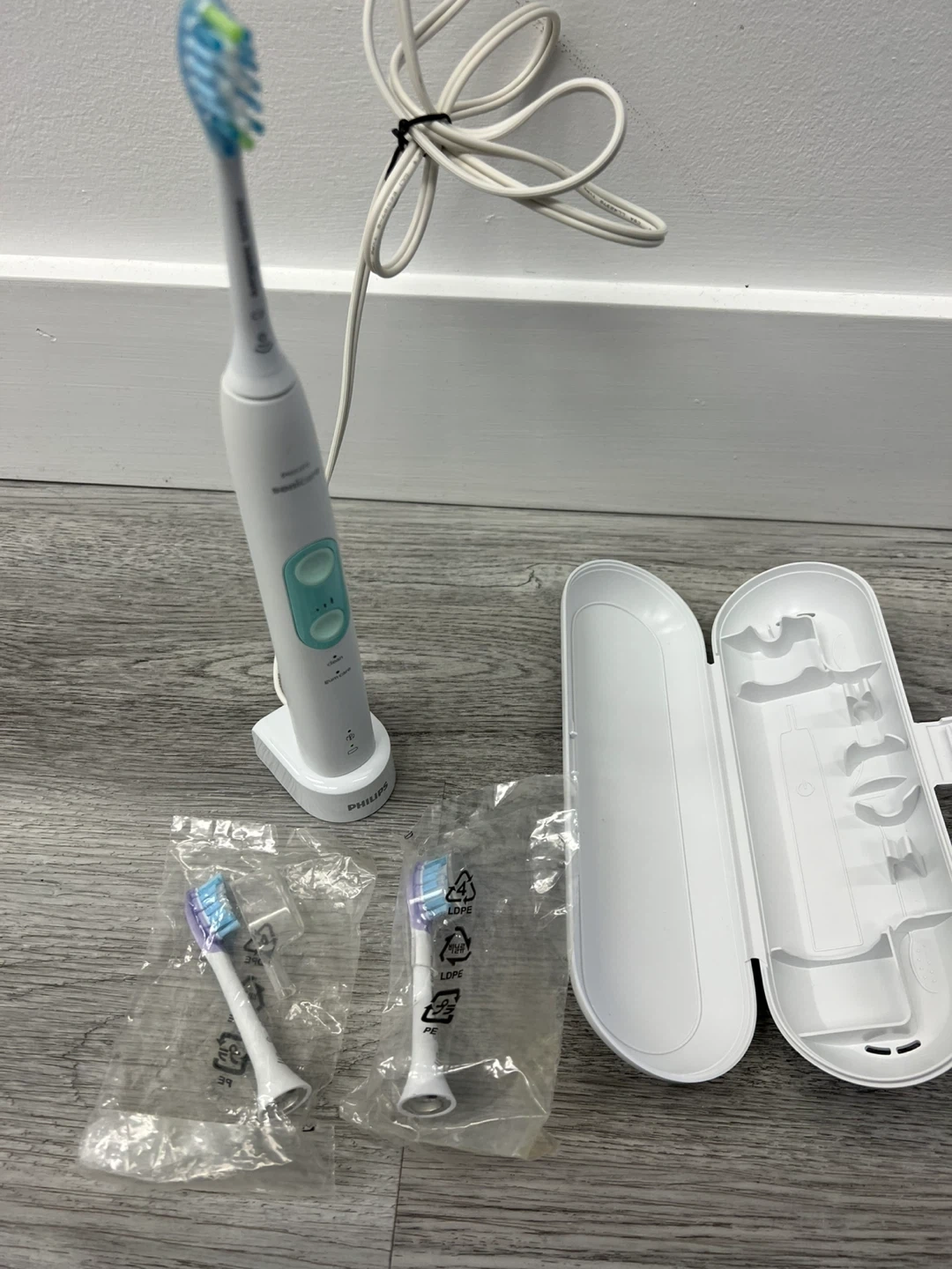 Selling a Philips Sonicare electric toothbrush. It comes with the charger, travel case, and two additional brush heads. Perfect for keeping your pearly whites sparkling clean!