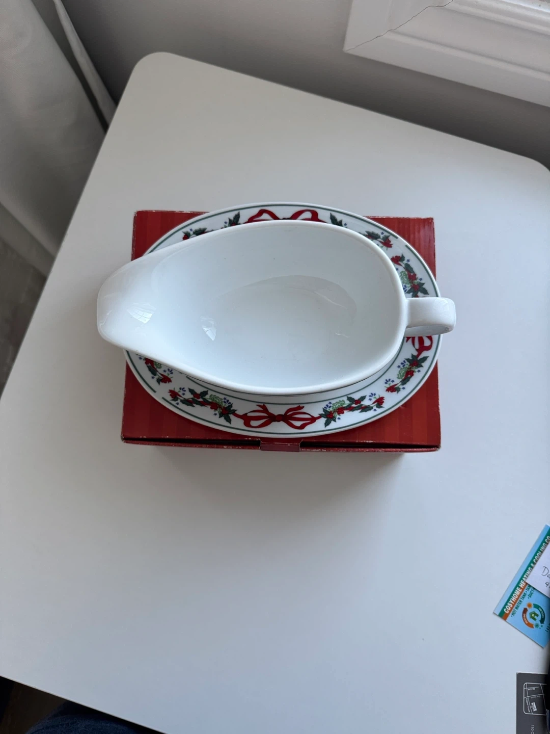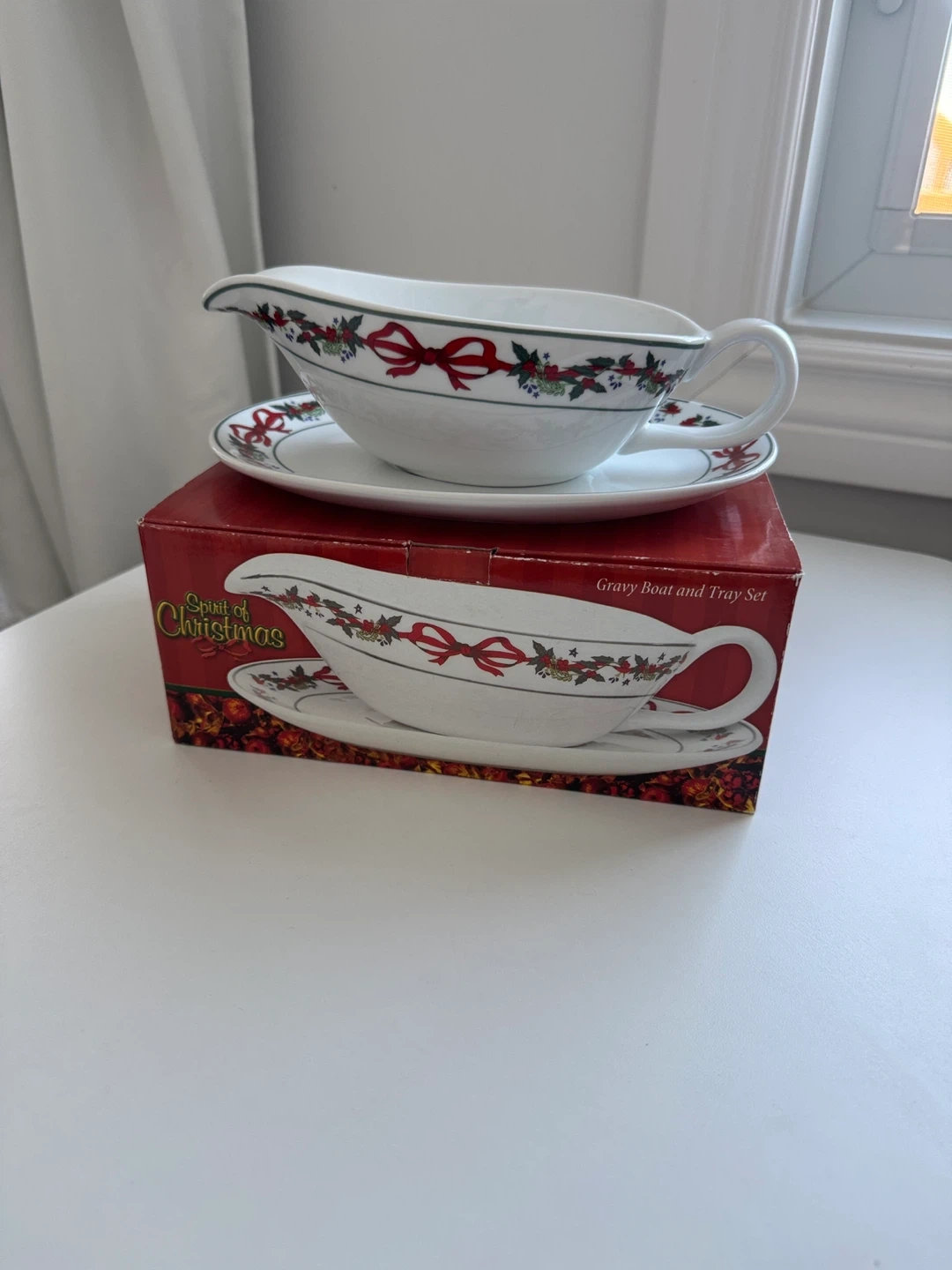 Selling a Spirit of Christmas gravy boat and tray set. It comes with its original box and features a festive holiday design with red ribbons and holly. Perfect for your holiday dinners!