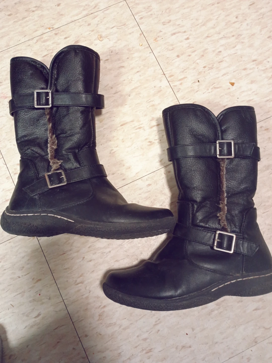 These black leather boots feature a stylish buckle detail and a comfortable design. They're perfect for adding a bit of edge to your outfit. Great for everyday wear!