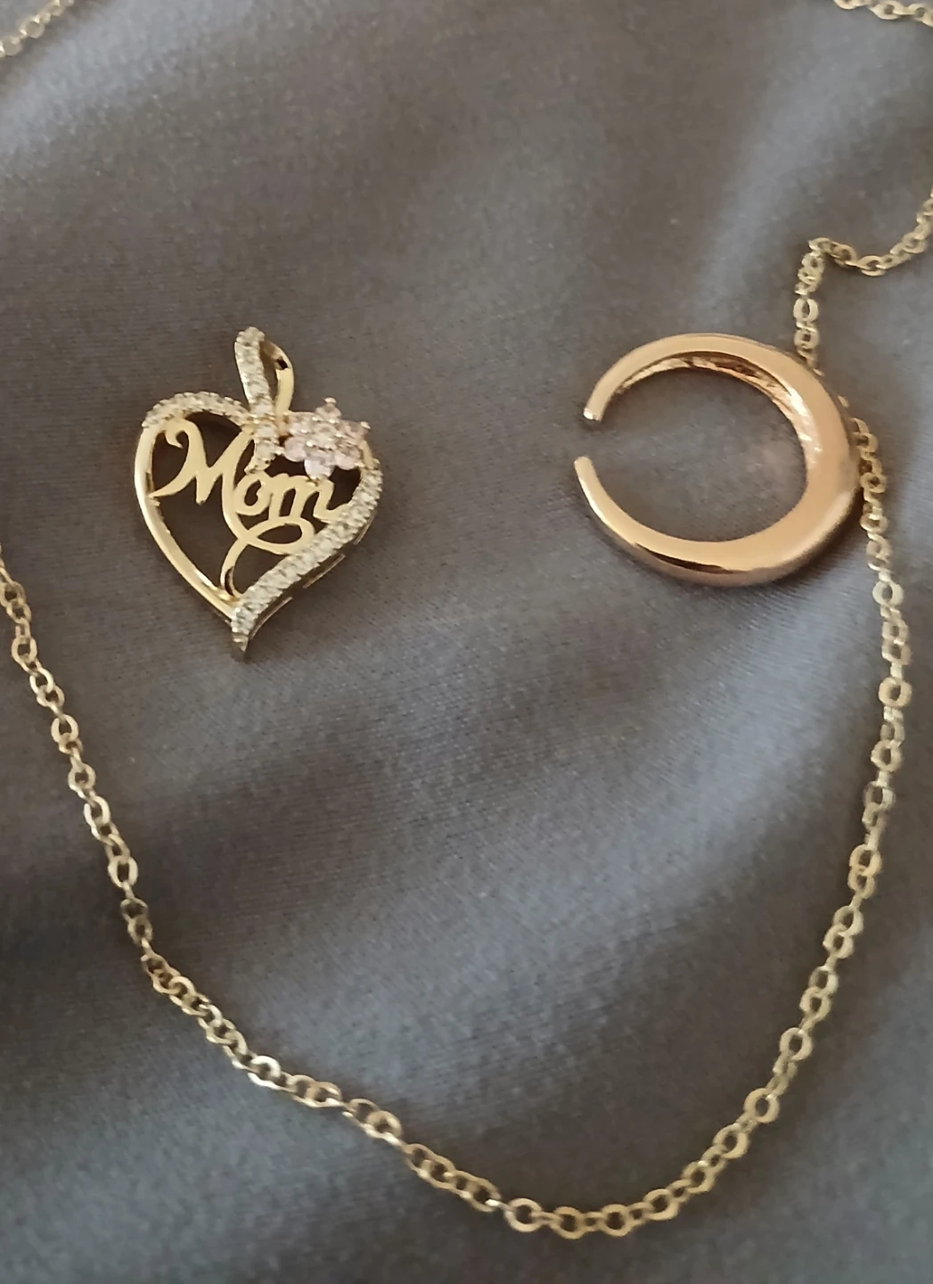 Selling a cute gold necklace with a heart-shaped 'Mom' pendant. It has a lovely design with small stones around the heart. Also included is a simple gold-tone ring pendant.