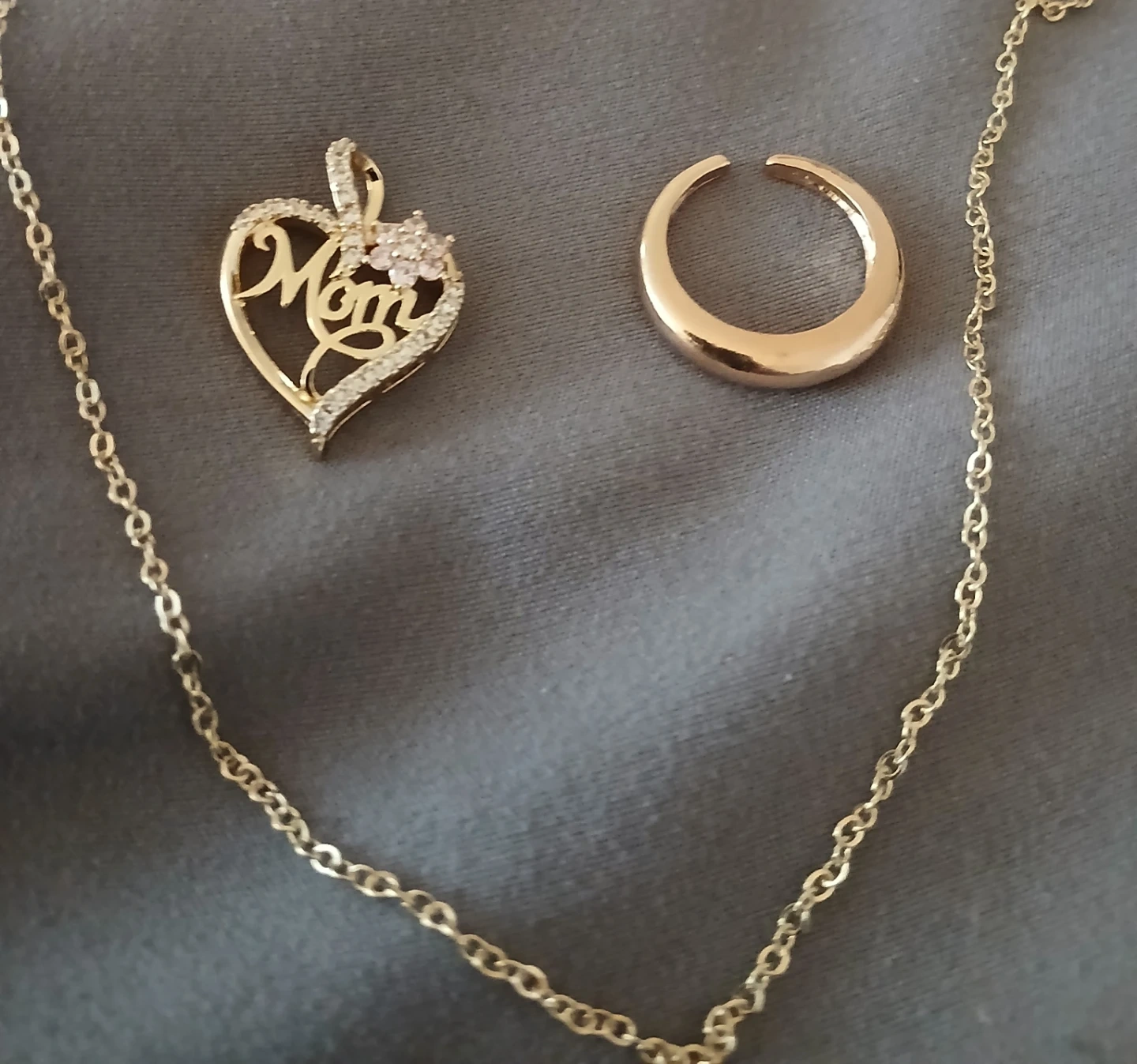 Selling a cute gold necklace with a heart-shaped 'Mom' pendant. It has a lovely design with small stones around the heart. Also included is a simple gold-tone ring pendant.