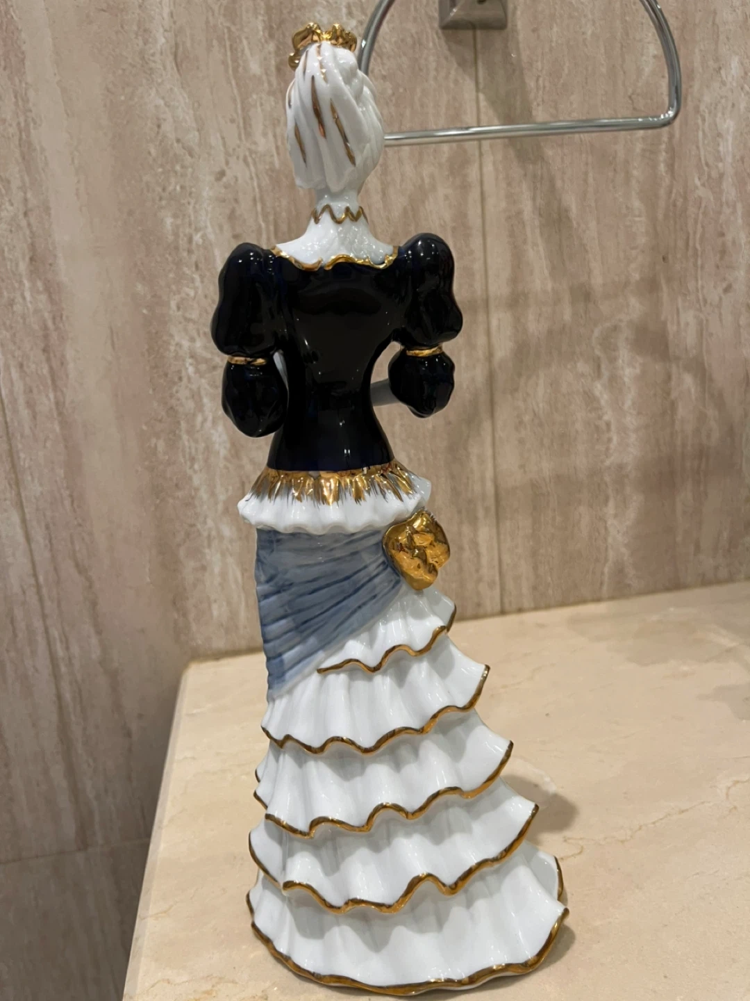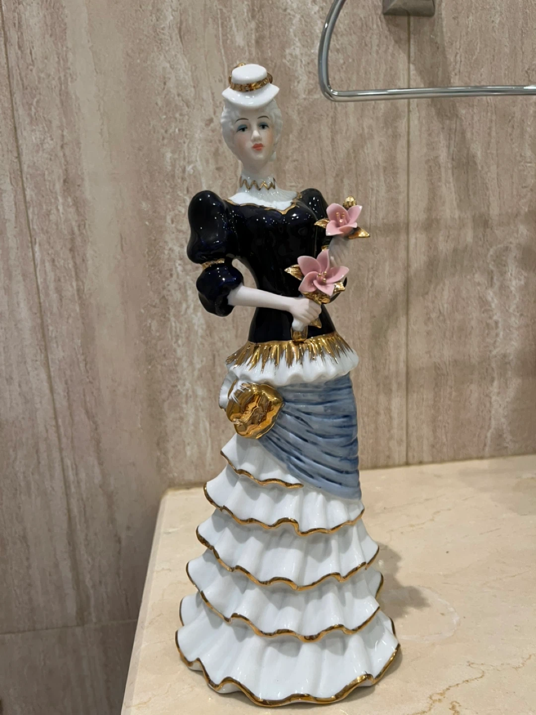 Here is a lovely Royal Alfredo figurine! It features a lady holding pink flowers, dressed in a blue and white dress with black accents.