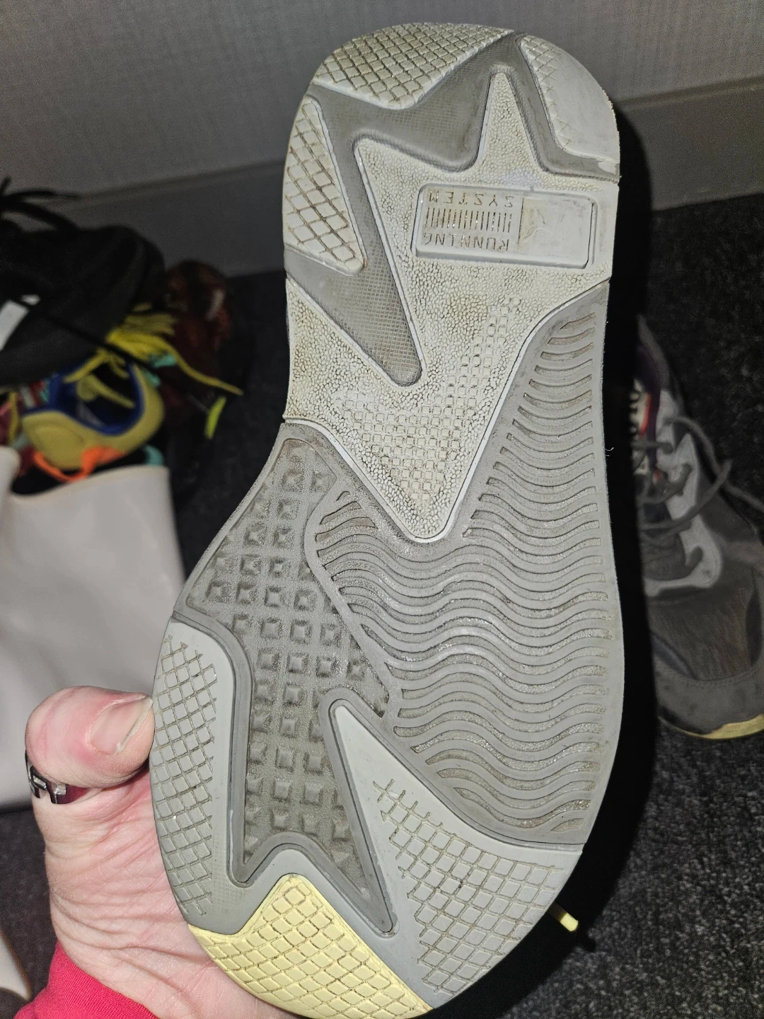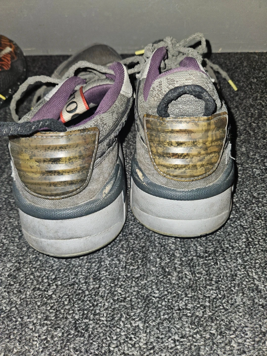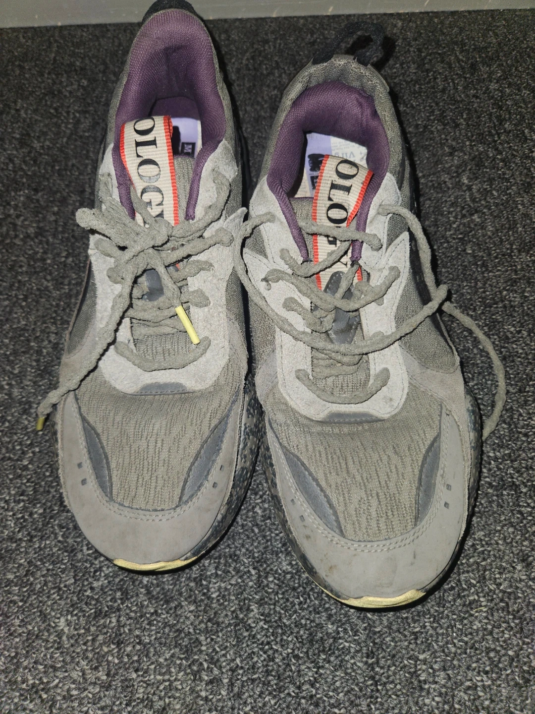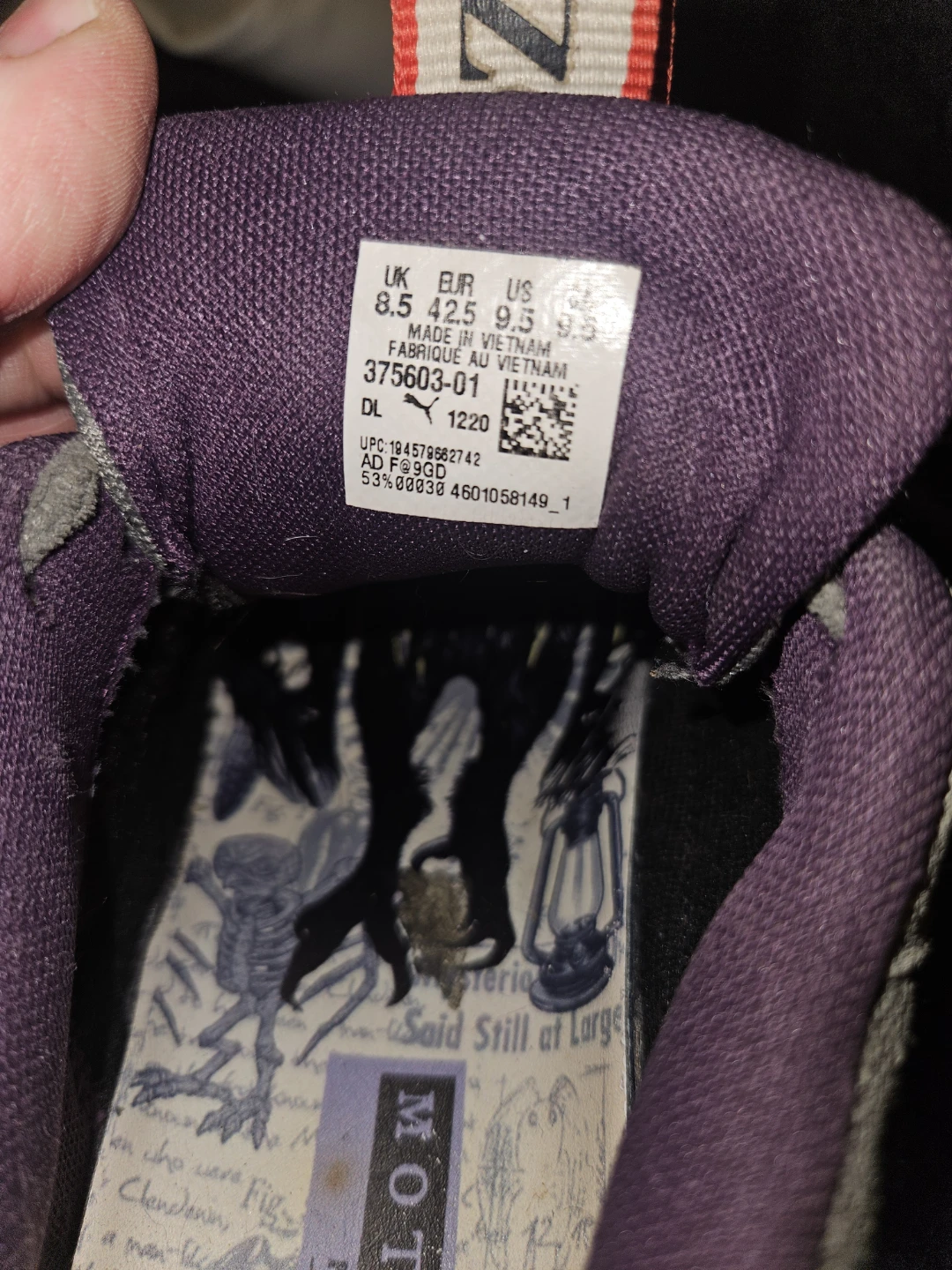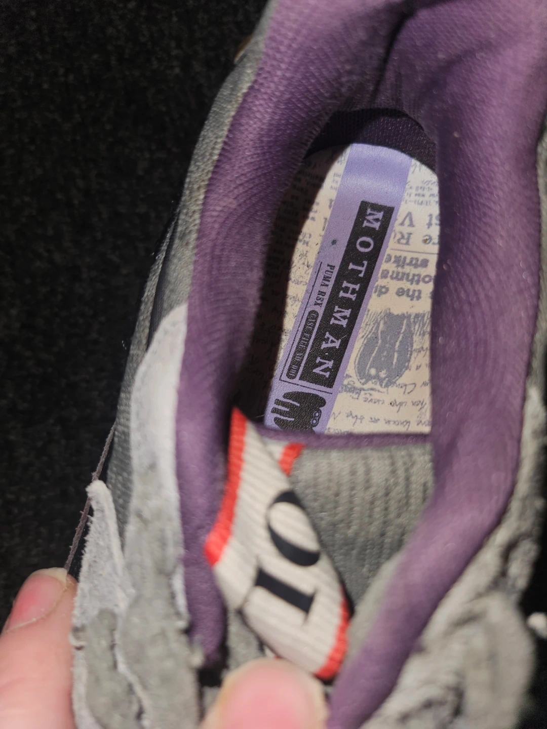 Selling a pair of Puma RS-X Efekt Mothman shoes in US size 9.5. They're in used condition, as you can see in the pictures. They have a grey colourway with purple lining. The shoes have a unique design on the insole featuring the Mothman.