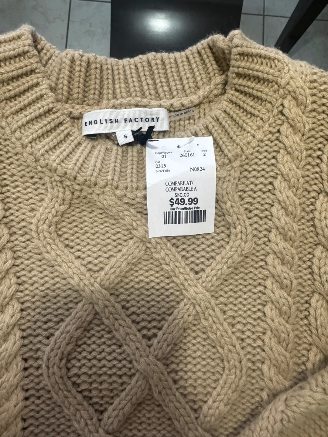 Cozy up in this English Factory cable knit sweater! It's a size small and features a beautiful cable knit design. The tag shows it was originally priced at $49.99
