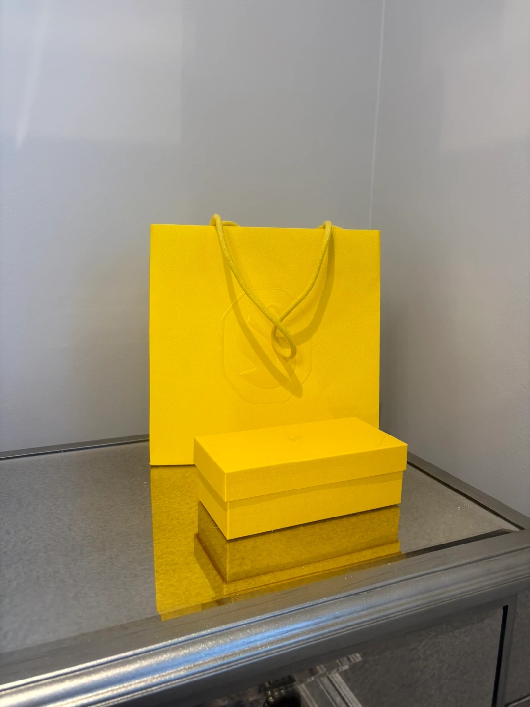 Selling a yellow Swarovski box and bag set. The box measures 19cm x 6cm, and the bag is 26cm x 28cm. It comes with the original box. Can be purchased together or individually.