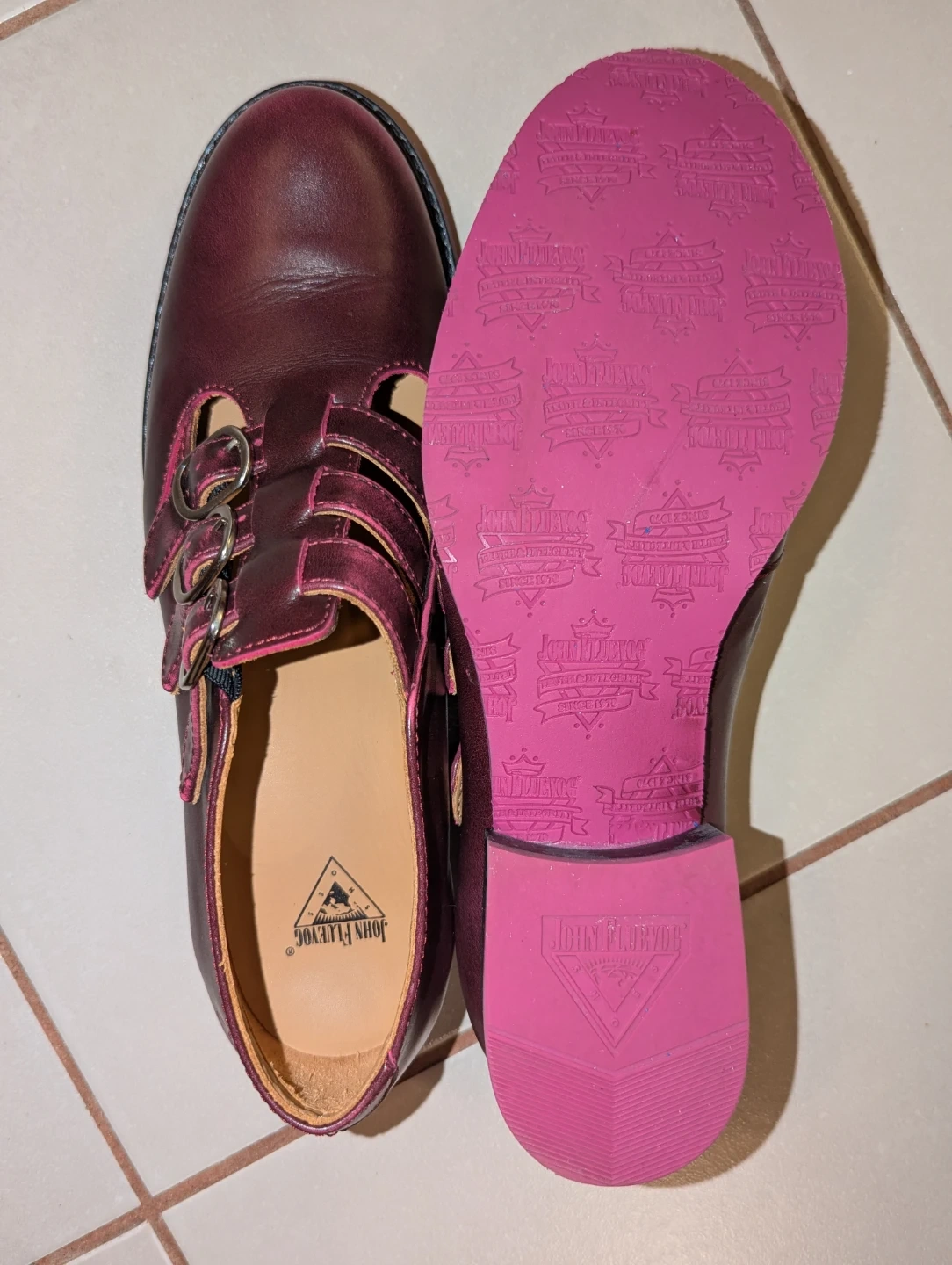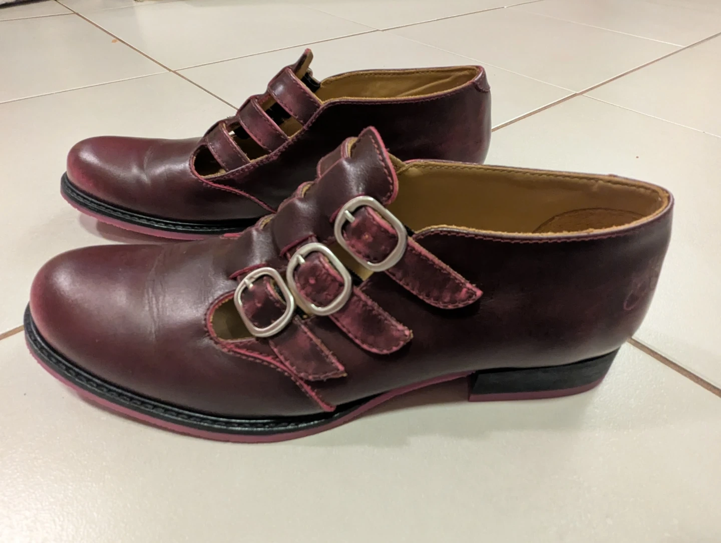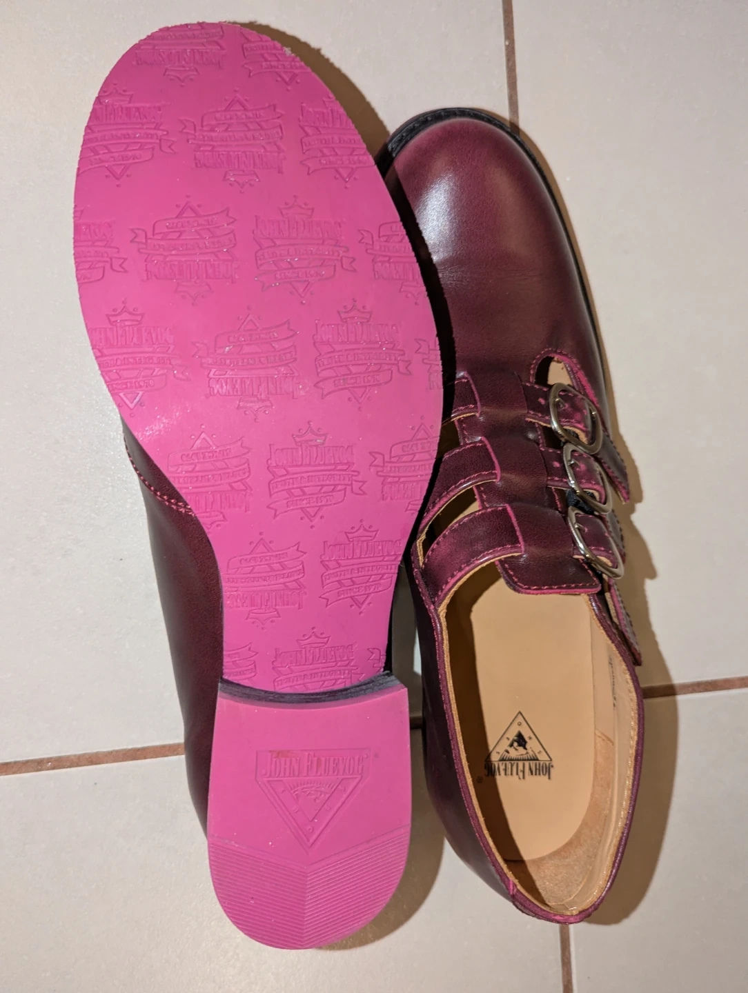 These shoes have a purposeful aged look with pink undertones and a burgundy overtone. Signature pink soles, 3 adjustable buckles, and leather uppers.