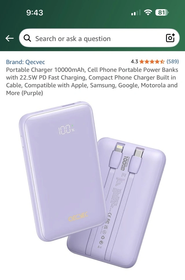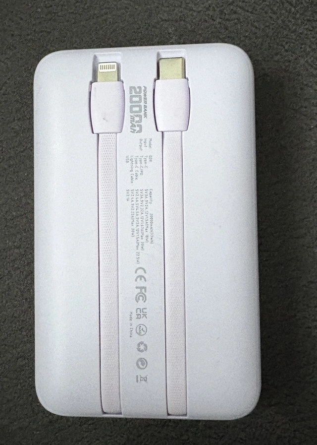 I'm selling a purple, compact, and portable Qecvec 10000mAh power bank with built-in cables. This charger features 22.5W PD Fast Charging and is compatible with Apple, Samsung, Google, Motorola, and more. The item is in used, but good condition.
