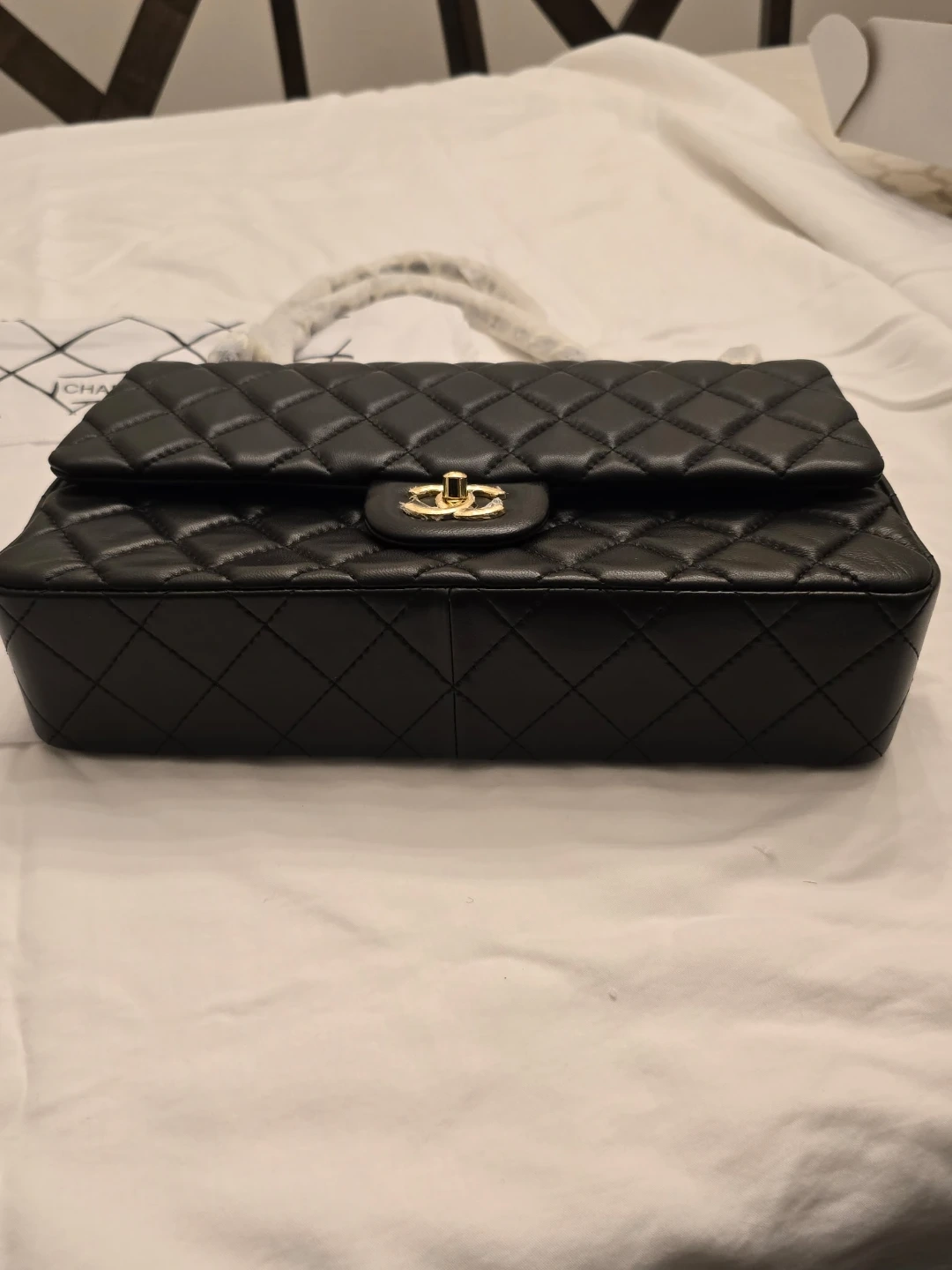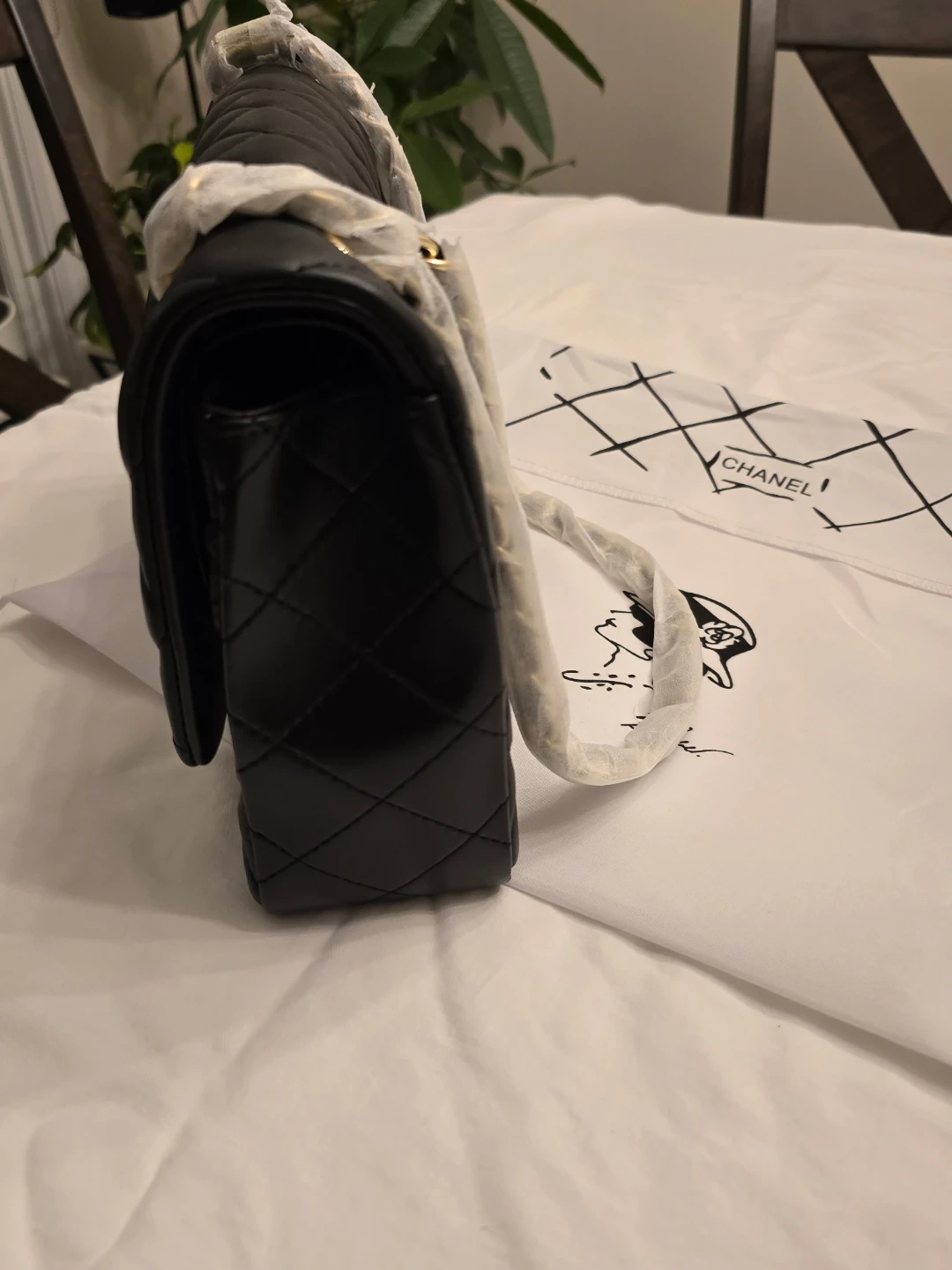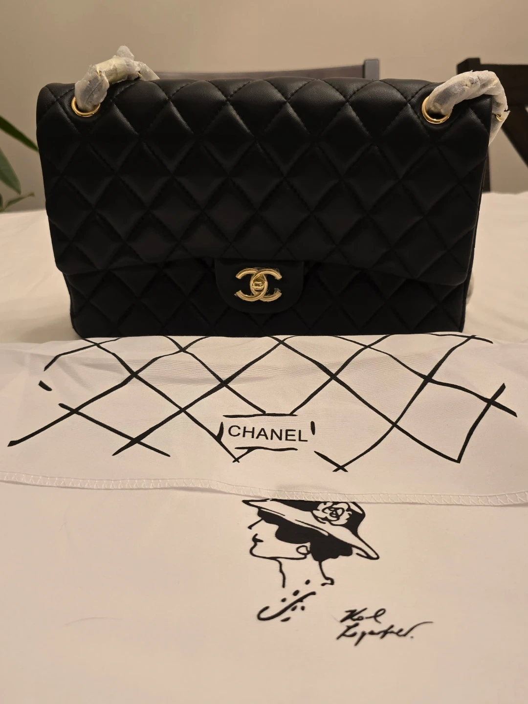 Classic Chanel handbag in black quilted leather. Features the iconic CC logo and chain strap. Interior is lined with leather and has multiple compartments. Perfect for adding a touch of elegance to any outfit!