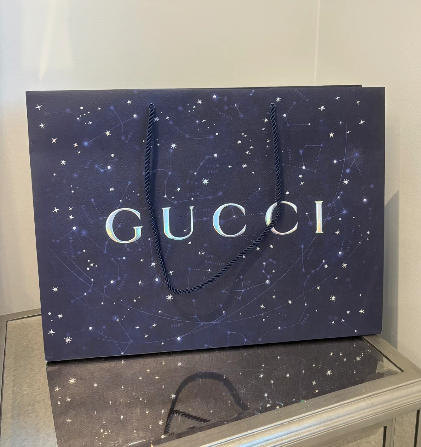 Selling a set of Gucci gift boxes and a shopping bag. The shopping bag features a lovely constellation design. The gift boxes are a signature Gucci green. Perfect for gifting or storage! Selling at $25 each or all for $100. Includes 2 shopping bags and 3 boxes.