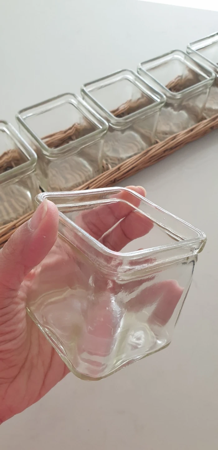 Selling a set of glass spice jars with a wicker tray! They're perfect for organizing your spices or small items in a stylish way. The set includes several square glass jars that sit neatly in a woven wicker tray. They're in great shape and ready to add a touch of rustic charm to your kitchen or pantry