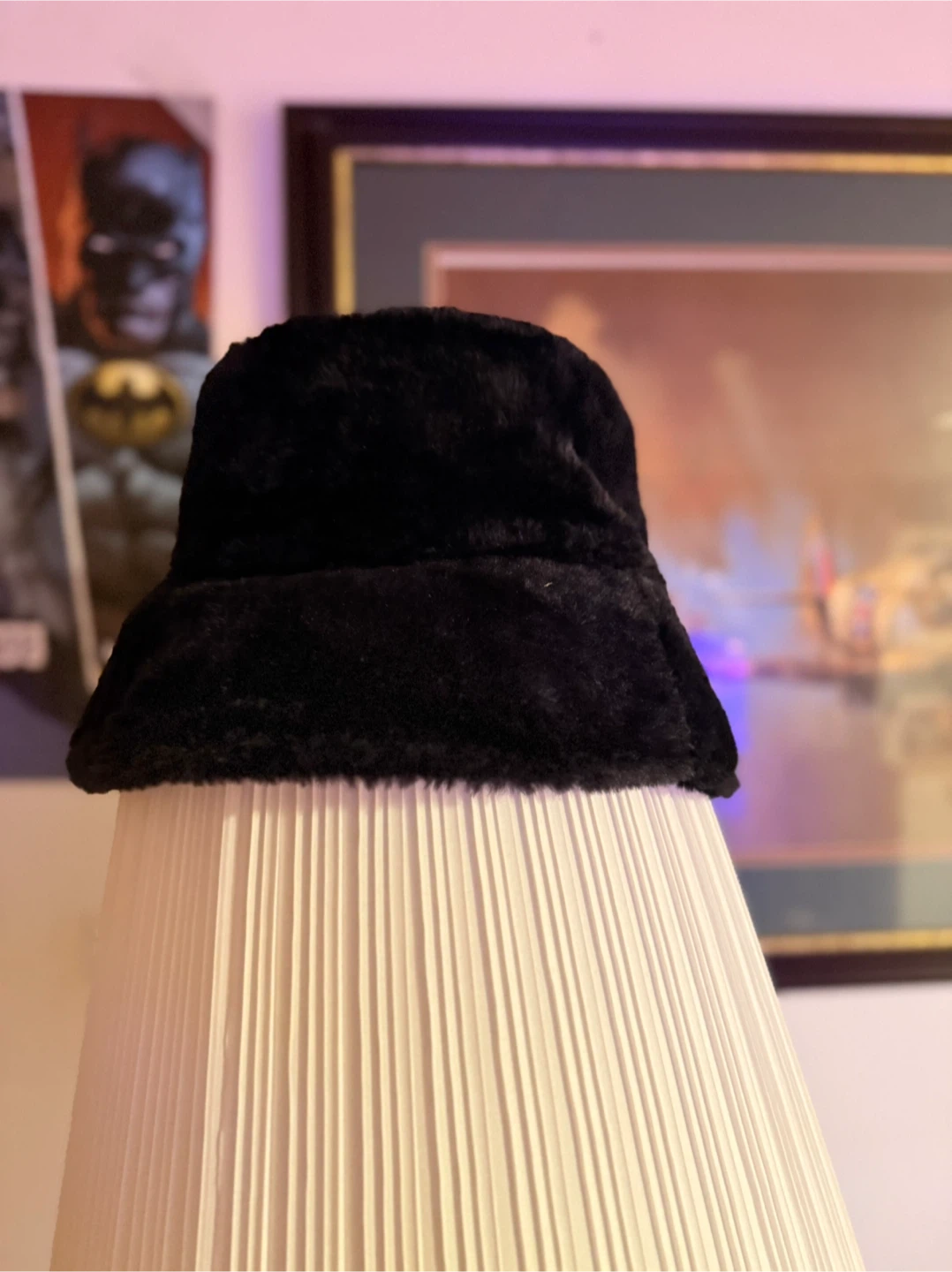 Here's a Bluenotes stylish black faux fur bucket hat! It's super soft and perfect for adding a touch of warmth and style to any outfit. It's in great condition and ready for a new owner