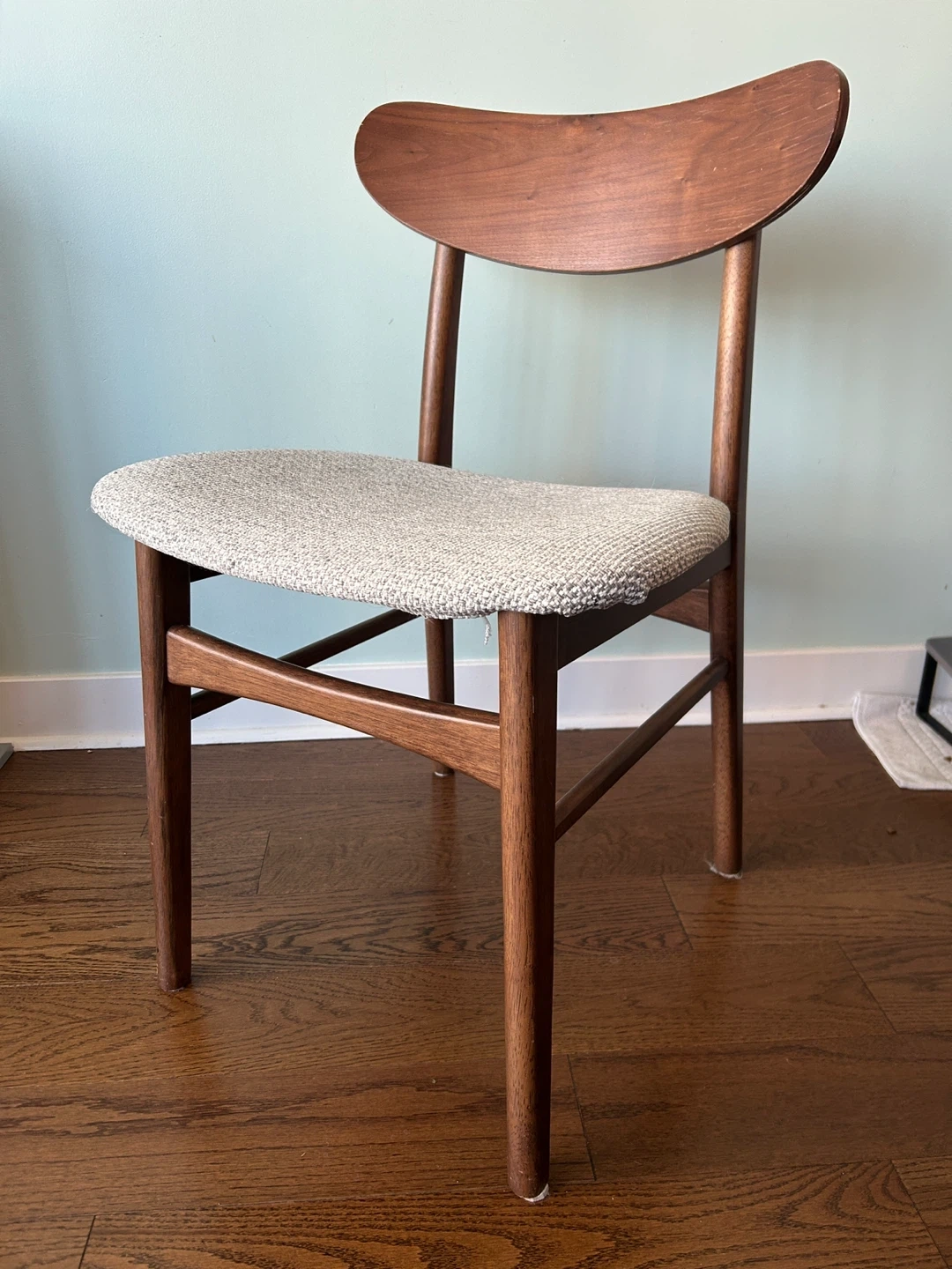 Selling a lovely wooden dining chair! It has a comfortable grey upholstered seat and a stylish curved back. Perfect for adding a touch of mid-century modern to your dining space or kitchen