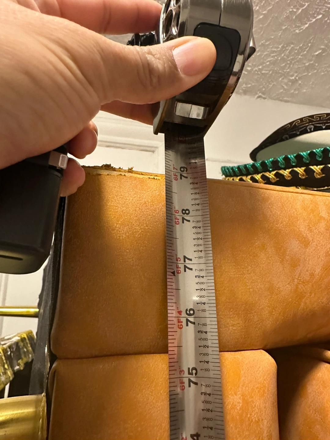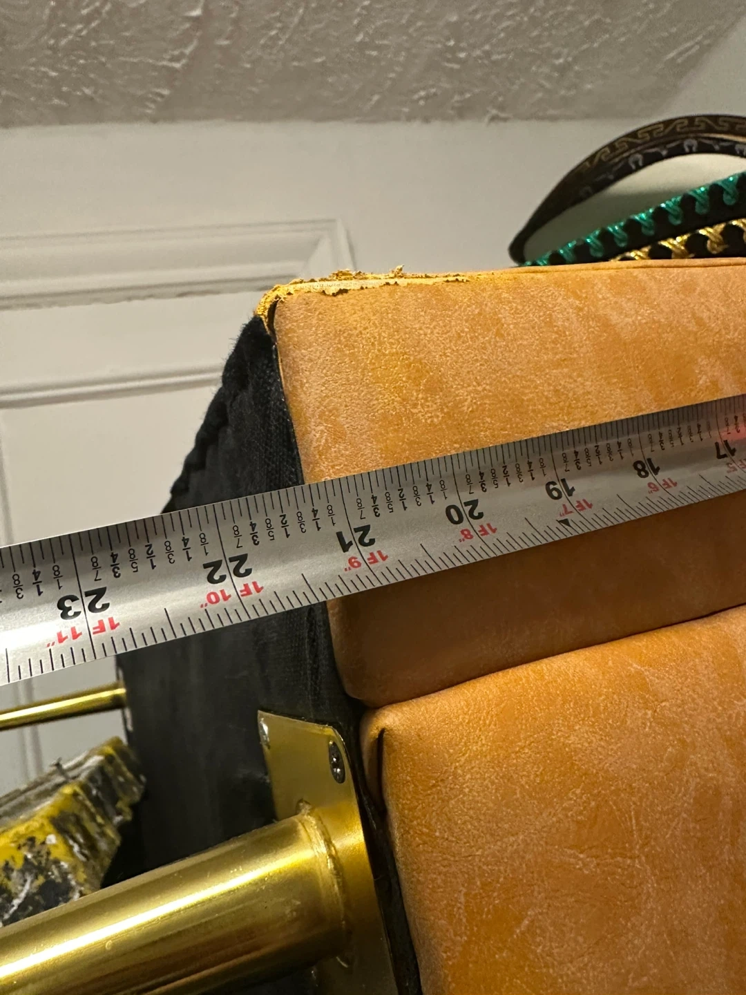 Selling a tan sofa that's in great shape! It comes with two matching pillows. The sofa features a tufted design and has gold-colored legs. It's a stylish and comfortable piece for any living room
