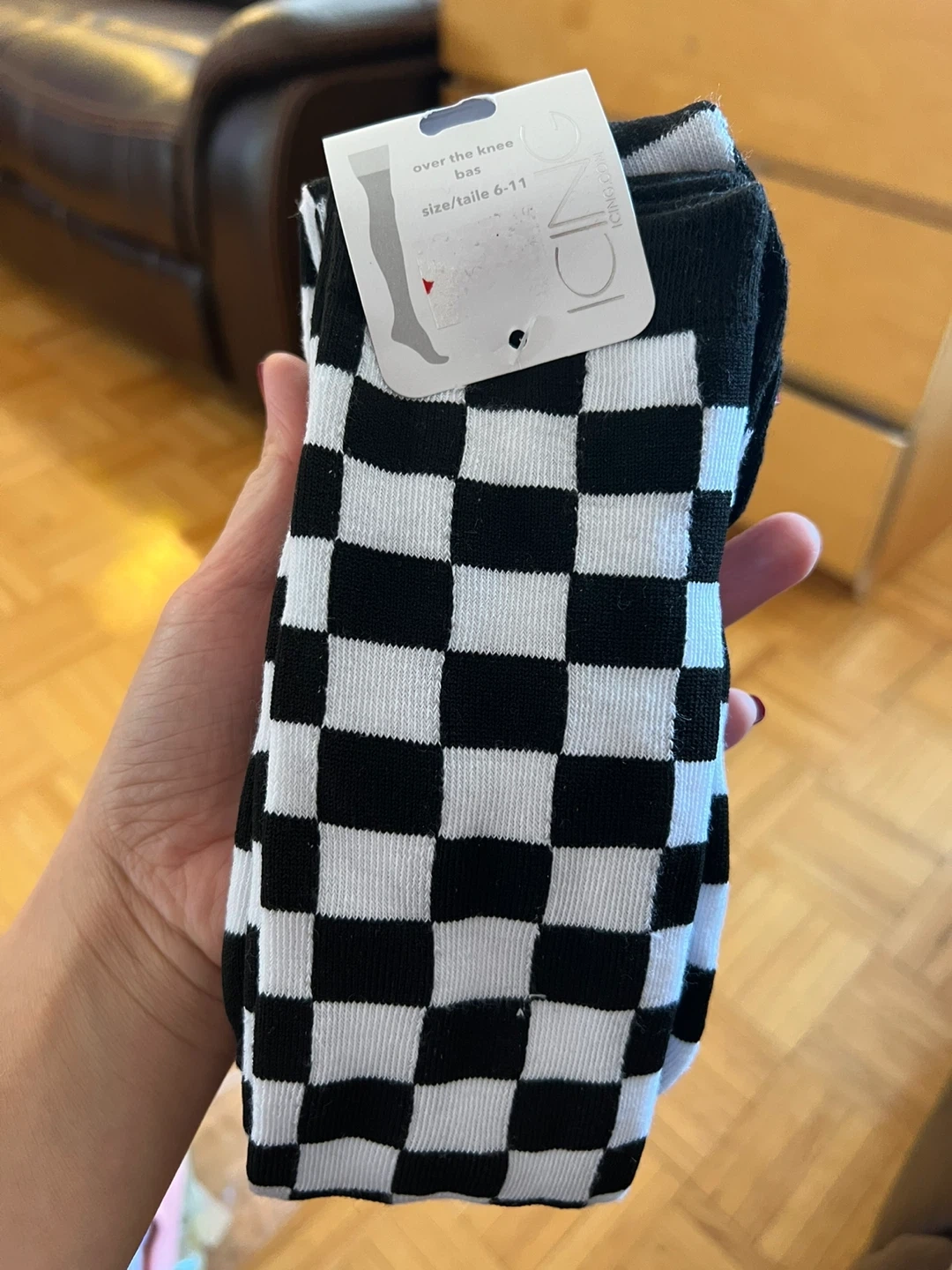 Selling a pair of Icing brand over-the-knee socks! They have a cool black and white checkerboard pattern and are size 6-11